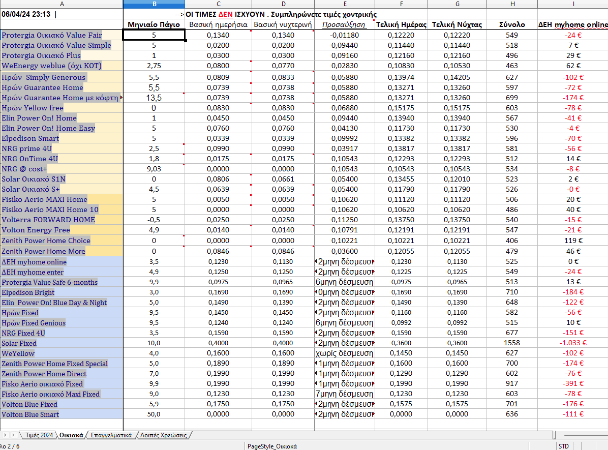 Καλησπέρα. Είναι η πρώτη μου φορά που θα αναλάβω νοικοκυριό (με την κοπέλα μου). Διάβασα τα excel, αλλά δε κατάλαβα πολλά. Επίσης, δε ξέρω που περίπου κυμαίνονται οι καταναλώσεις. Μιλάμε για σπίτι ~30τμ, δύο άτομα, και έχει ήδη φυσικό αέριο στη Ζενίθ. Με ενδιαφέρουν κυρίως τα σταθερά τιμολόγια. Είδα ότι η Ζενίθ κάνει μεγάλη έκπτωση σε πληρωμές συνέπειας στο σταθερό. Να βάλω ρεύμα στη Ζενίθ, ή στη ΔΕΗ, και γιατί, αν επιτρέπεται;