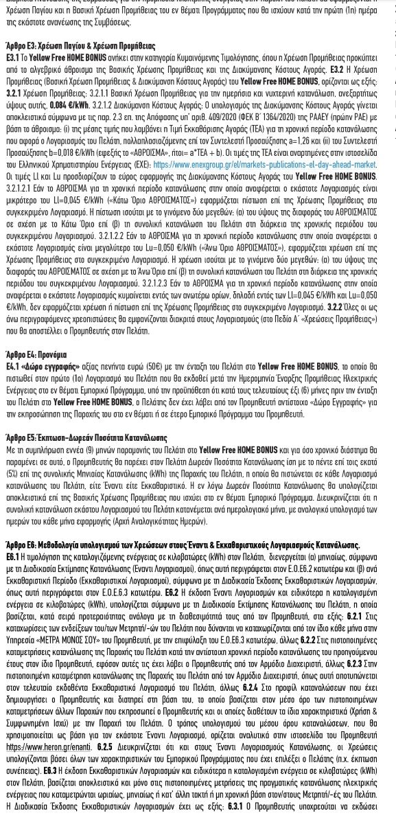 Καλησπέρα. Χθες έκανα e-contract στον ΗΡΩΝ για το καινούριο πρόγραμμα το Yellow free home. Πριν λίγο μου στέλνουν τη σύμβαση και με πήρανε τηλέφωνο για να πουν το ποίημα. Διαβάζω τη σύμβαση πριν την υπογράψω μέσω gov και βλέπω μια περίεργη παράγραφο (άρθρο Ε4 στους ειδικούς όρους). Πριν πάρω τηλέφωνο για διευκρινήσεις, είπα να το μοιραστώ εδώ μήπως προλάβω κανέναν που είναι σε φάση υπογραφής.