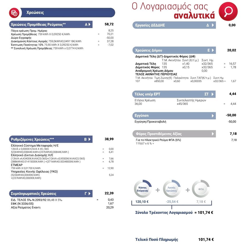 • Τιμολόγηση: Αρχική: 0,124 λεπτά ανά kwh , Τελική τιμή (με συνέπεια) : 0,093 λεπτά ανά kwh κλειδωμένη  για 6 Μηνες.