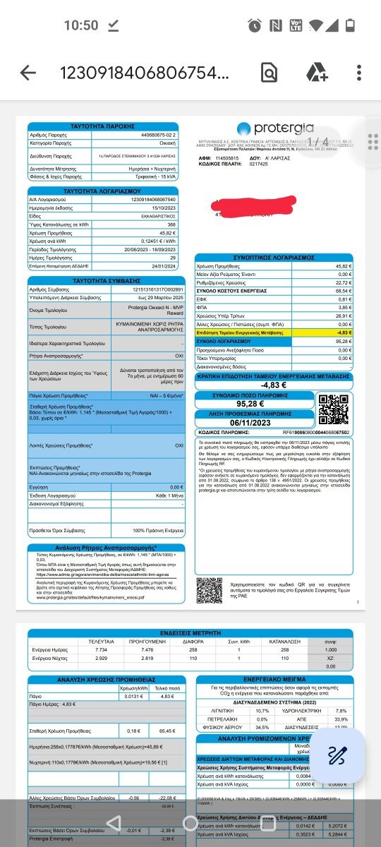 Δεν ξερω απο τα πράσινα  κίτρινα τιμολόγια κλπ πώς θα είναι. Επισυνάπτω το τελευταίο μου τιμολόγιο, την τιμή της κιλοβατώρας πώς την βλέπετε; να πω οτι είναι δυο νοικοκυριά περίπου οπότε η κατανάλωση είναι αναλόγως χαμηλή. Ευχαριστώ
