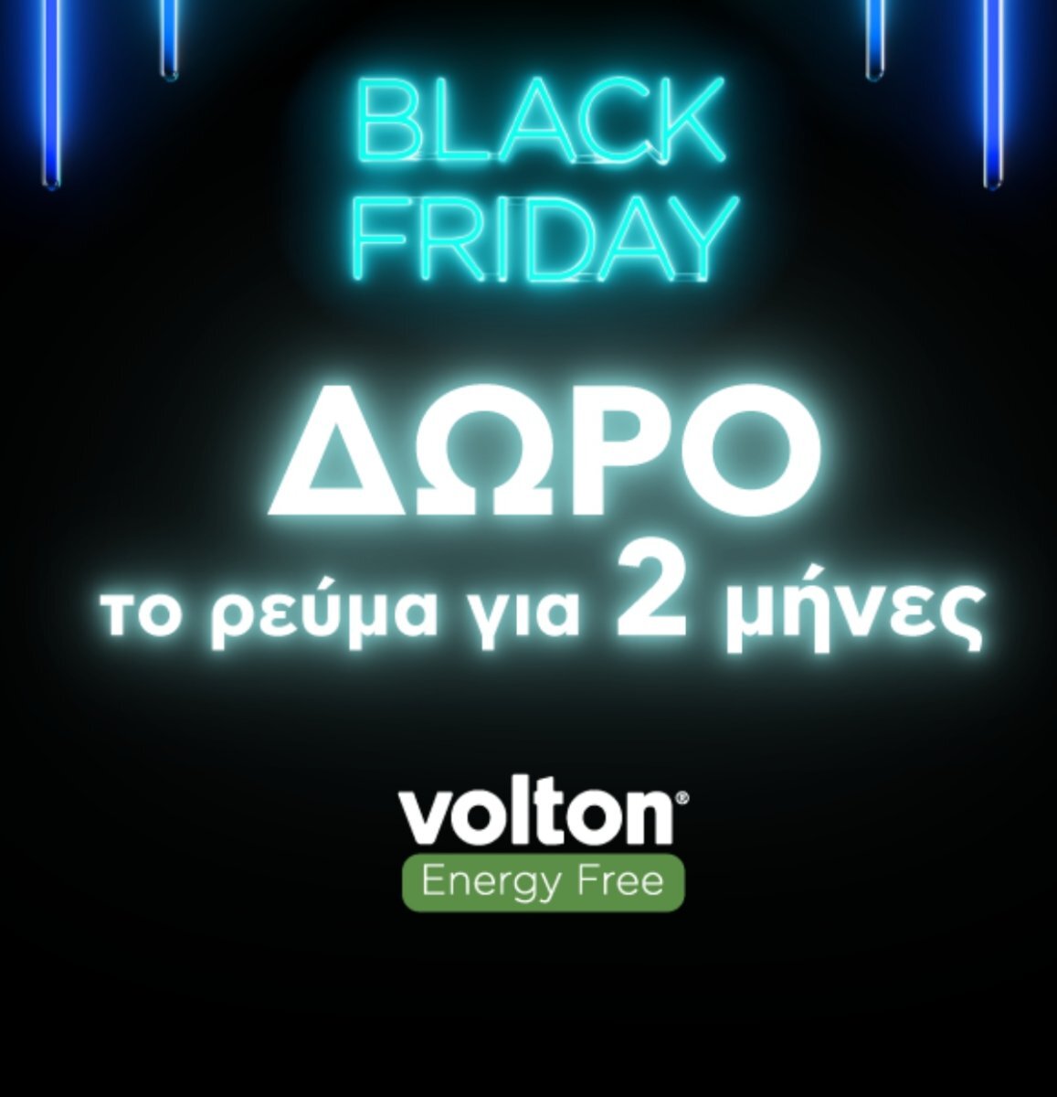 Η προσφορά Black Friday ισχύει για αιτήσεις από 17 – 27/11/2023. Η δωρεάν παροχή ηλεκτρικής ενέργειας (χρέωση ενέργειας & πάγιο) ισχύει για τον 1ο και 7ο μήνα από την ενεργοποίηση της παροχής στην Volton