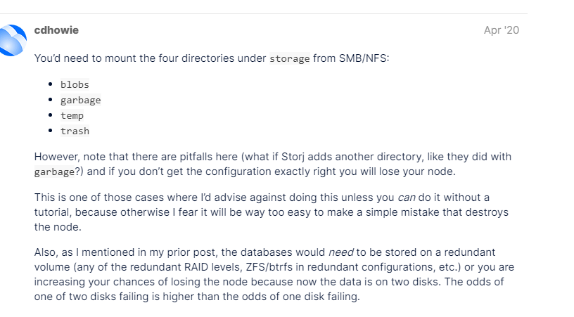valadsk Δημοσ. 17 Σεπτεμβρίου 2022 Δημοσ. 17 Σεπτεμβρίου 2022 (επεξεργασμένο) Λοιπόν το project έχει ως εξής. Έχω storagebox της Hetzner που λόγω δουλειάς το έχω πλέον πολύ φθηνά. Υποστηρίζει, samba, webdav, ftp και πλήθος άλλων προτοκόλλων. Έχει διαθέσιμο χώρο 9TB που πάει χαμένος, δεν χρησιμοποιείται. Έχω ήδη γίνει Node operator στο Storj δοκιμαστικά με ένα drive που είχα 1TB, αλλά επειδή δεν παίζει να αφήνω 24/7 το PC ανοιχτό + το κέρδος είναι αμελητέο, θα πάω σε VPS που ήδη πληρώνω για δική μου χρήση. Παράλληλα, θα αξιοποιήσω το storagebox τα 9TB που έχω ως χωρητικότητα που θα τη δώσω στο Storj. Το πρόβλημα όμως είναι ότι δεν υποστηρίζει Network mapped drives. Το πρόγραμμα του Storj δημιουργεί τους εξής φακέλους στο directory που θα το βάλεις να αποθηκεύσει και εκτός των φακέλων sql databases: blobs garbage temp trash Και θέλω να κάνω αυτό που λέει εδώ το μήνυμα αλλά δεν γνωρίζω πως. Καμιά ιδέα; Εν ολίγοις, να εχω τους φακέλους blobs, garbage,temp kai trash στο network mapped drive και τις sql databases σε φυσικό δίσκο του VPS. Η sql databases δεν υποστηρίζουν networkj mapped drives. Επεξ/σία 17 Σεπτεμβρίου 2022 από valadsk