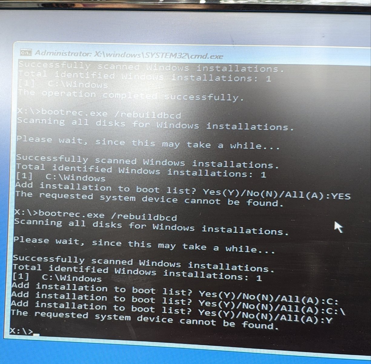 JiovanniGeorgeo Δημοσ. 24 Οκτωβρίου 2022 Δημοσ. 24 Οκτωβρίου 2022 ..πρόσφατα το έκανα ο ίδιος set up, και άντε τώρα να εξηγήσεις πως δε φταις.. Είχα εγκαταστήσει σε ένα παλιό PC με Pentium έναν ssd. Εδώ και μια βδομάδα έρχομαι και το δουλεύω μια χαρά. Σήμερα μου έδωσαν να τυπώσω το περιεχόμενο από κάτι CD. Και επειδή είχα αποσυνδέσει το DVD, το μόνο που έκανα ήταν να συνδέσω αυτό και να αποσύνδεσω έναν σκληρό που δεν τον χρησιμοποιούν καν. Από τότε NO BOOT DEVICE. Έκανα τα πάντα, δηλαδή έκανα τα παρακάτω.. 1. Αποσύνδεσα κάθε άχρηστο μηχανιμα και άφησα μόνο ssd. Ούτε usb ούτε τίποτα. 2. Προσπάθησα να κάνω repair με το ίδιο flashusb που εγκατέστησα τα windows10, μέσα σε ένα κλάσμα σταματάει και λέει δε μπόρεσε να κάνει repair. Μάλλον δε τον βλέπει. 3. Έκανα προσεκτικά όλη τη διαδικασία με το fix boot στο CMD του repair usb. Όλα καλά πάνε, στο τελευταίο command πάλι δε δέχεται αυτό το δίσκο για OS disk (ΠΑΡΑΘΈΤΩ ΕΙΚΟΝΑ). 4. ΕΠΑΙΞΑ ΜΕ ΟΛΑ ΤΑ BIOS OPTIONS! Από UEFI, σε Legacy και το αντίθετο πάλι. Επέλεξα και κάτι επιλογές για Windows10.. αυτές αφαιρούν το Legacy άρα δε βλέπει τον δίσκο καν μετά.. Σας παρακαλώ βοηθήστε με, καθώς αν τα κάνω όλα πάλι από την αρχή είναι πόνος... Δε μπορεί να χάθηκε έτσι ένα λειτουργικό απλά με ένα restart.. Είναι και της δουλειάς και θα με κρεμάσουν..