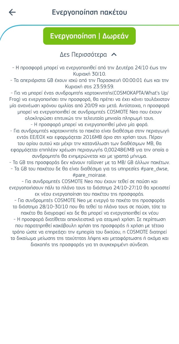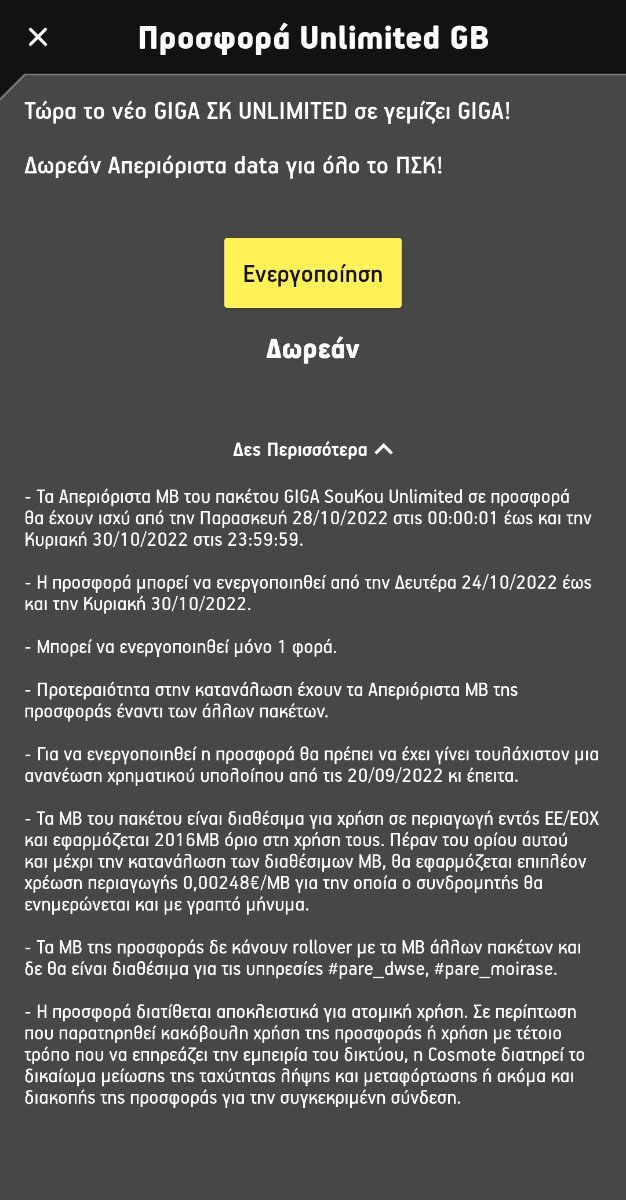 dim_plo Δημοσ. 24 Οκτωβρίου 2022 Δημοσ. 24 Οκτωβρίου 2022 (επεξεργασμένο) - Τα Απεριόριστα ΜB του πακέτου GIGA SouKou Unlimited σε προσφορά θα έχουν ισχύ από την Παρασκευή 28/10/2022 στις 00:00:01 έως και την Κυριακή 30/10/2022 στις 23:59:59. - H προσφορά μπορεί να ενεργοποιηθεί από την Δευτέρα 24/10/2022 έως και την Κυριακή 30/10/2022. - Για να ενεργοποιηθεί η προσφορά θα πρέπει να έχει γίνει τουλάχιστον μια ανανέωση χρηματικού υπολοίπου από τις 20/09/2022 κι έπειτα. Πλήρεις όροι: Επεξ/σία 24 Οκτωβρίου 2022 από dim_plo 8 2