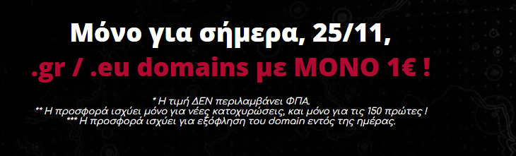 mikegad Δημοσ. 25 Νοεμβρίου 2022 Δημοσ. 25 Νοεμβρίου 2022 Έλαβα το παρακάτω μήνυμα από την IpHost, Νομίζω είναι η καλύτερη τιμή που έχω δει ποτέ για .gr domain Μόνο για σήμερα, 25/11, η IpHost ισοπεδώνει τις τιμές! .gr domain 1€ για τα 2 πρώτα έτη .eu domain 1€ για το πρώτο έτος * Η τιμή ΔΕΝ περιλαμβάνει ΦΠΑ ** Η προσφορά ισχύει μόνο για νέες κατοχυρώσεις, και μόνο για τις 150 πρώτες ! *** Η προσφορά ισχύει για εξόφληση του domain εντός της ημέρας. LInk 2