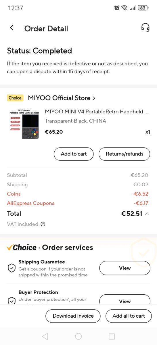40 ευρώ? Σίγουρα? Το πολύ έπεφτε τον Ιούνιο στα 55 ευρώ χωρίς sd με κουπόνι και coins! Αν πας στο Aliexpress στις αγορές σου φαίνονται στο processed παράδειγμα δικιά μου φώτο από miyoo mini v4 πόσο μου αφαιρεί από την αρχική τιμή με coins και κουπόνι!