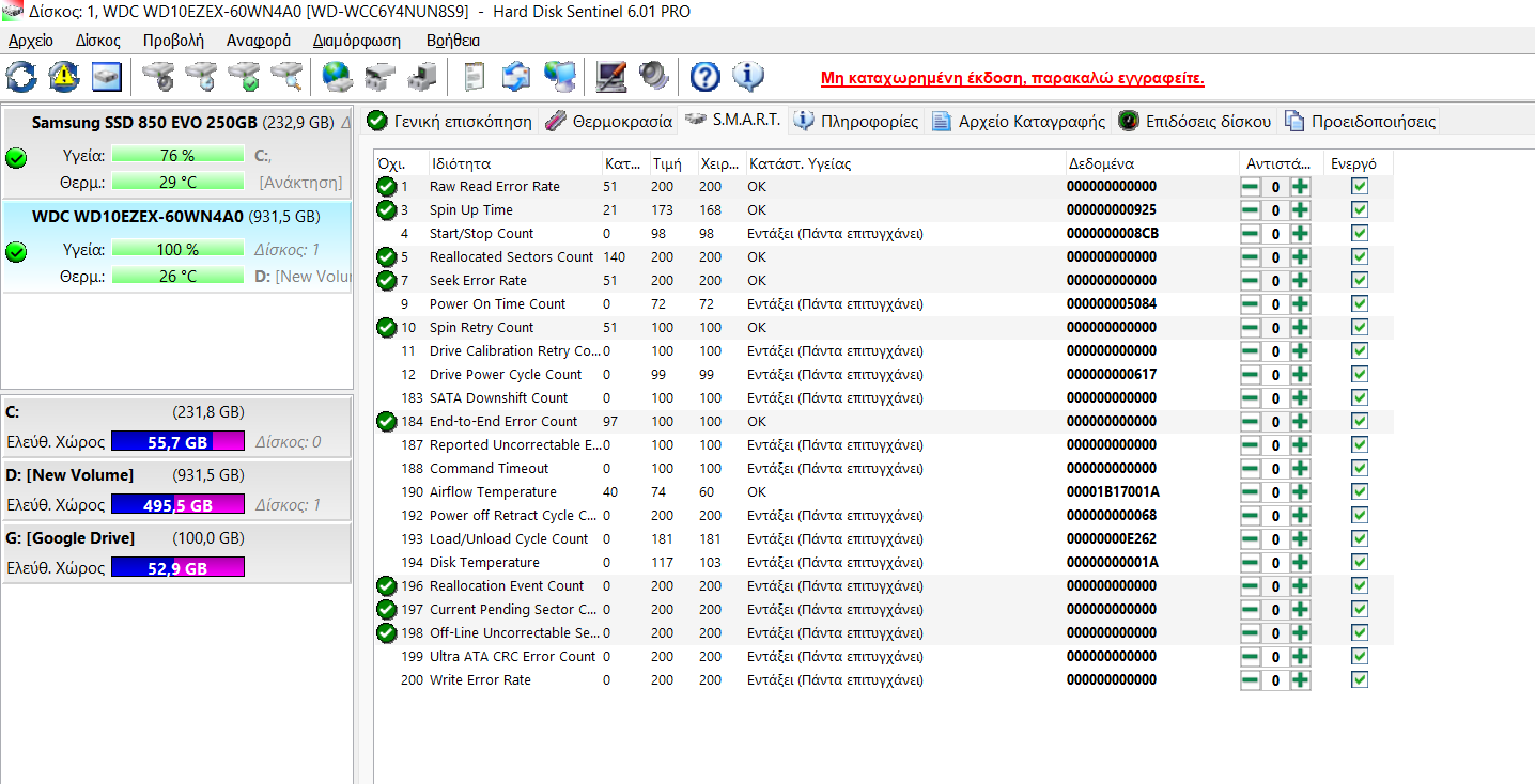 micos000 Δημοσ. 24 Δεκεμβρίου 2022 Δημοσ. 24 Δεκεμβρίου 2022 Τα screens του sentinel δείχνουν τον WD σε άριστη υγεία. Ο SSD όμως γιατί έχει 79% υγεία; Επέλεξε τον να δούμε τα στοιχεία του SMART. 1