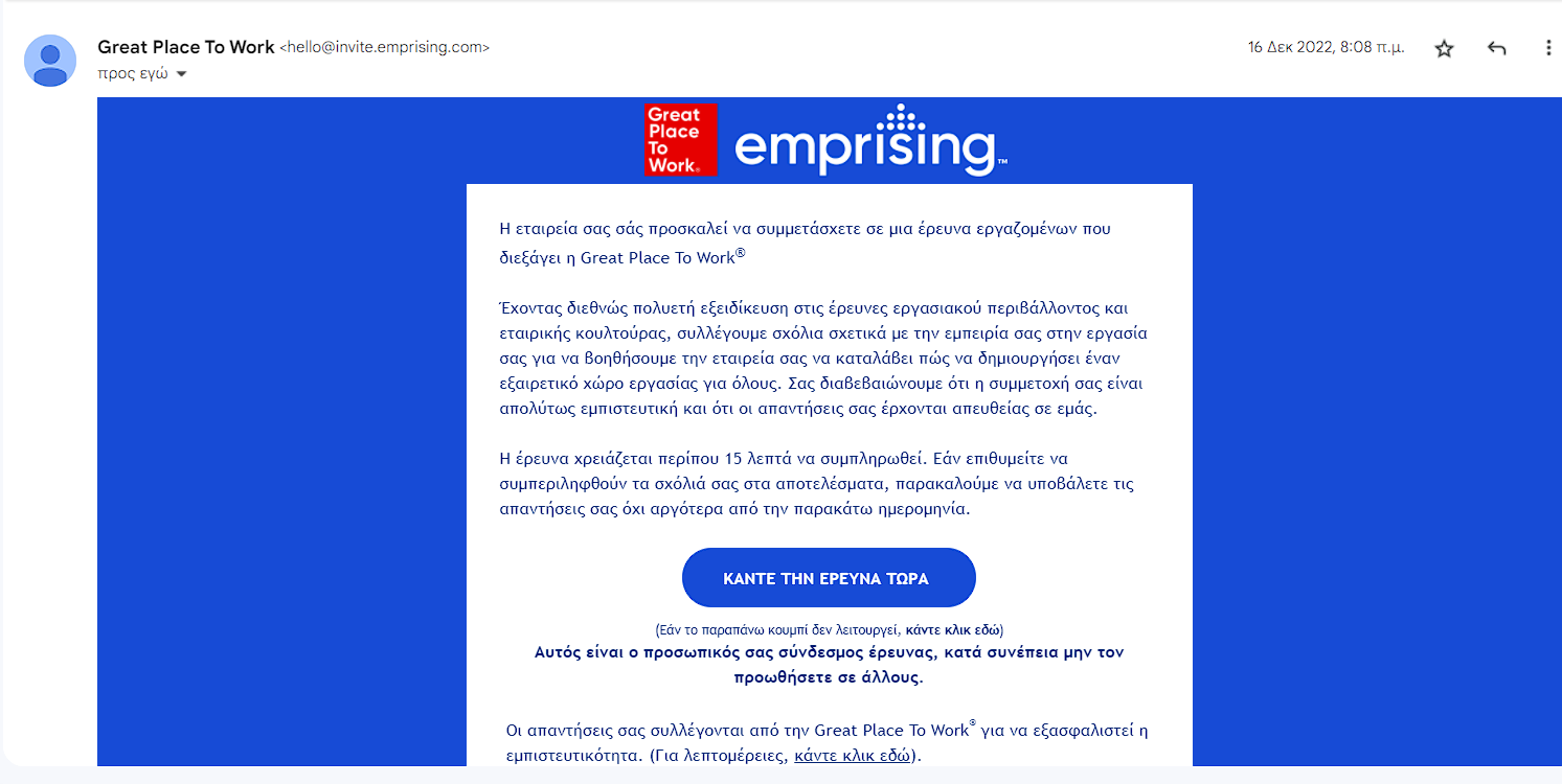 Επισκέπτης Δημοσ. 1 Ιανουαρίου 2023 Δημοσ. 1 Ιανουαρίου 2023 Το παρακάτω είναι μια παράγραφος από το ενημερωτικό email της εταιρίας πριν τη διεξαγωγή της έρευνας το οποίο έγραφε μεταξύ των άλλων: "Οι απαντήσεις είναι ανώνυμες και εμπιστευτικές και η εταιρεία μας θα παραλάβει στο τέλος μια έκθεση με τα συνολικά της αποτελέσματα. Τα αποτελέσματα, όταν θα μας δοθούν από τους διοργανωτές της έρευνας, θα αφορούν ομάδες / κατηγορίες εργαζομένων. Κανείς στην εταιρεία μας δεν θα έχει την δυνατότητα να μάθει τι απάντησε μεμονωμένα ο κάθε εργαζόμενος."