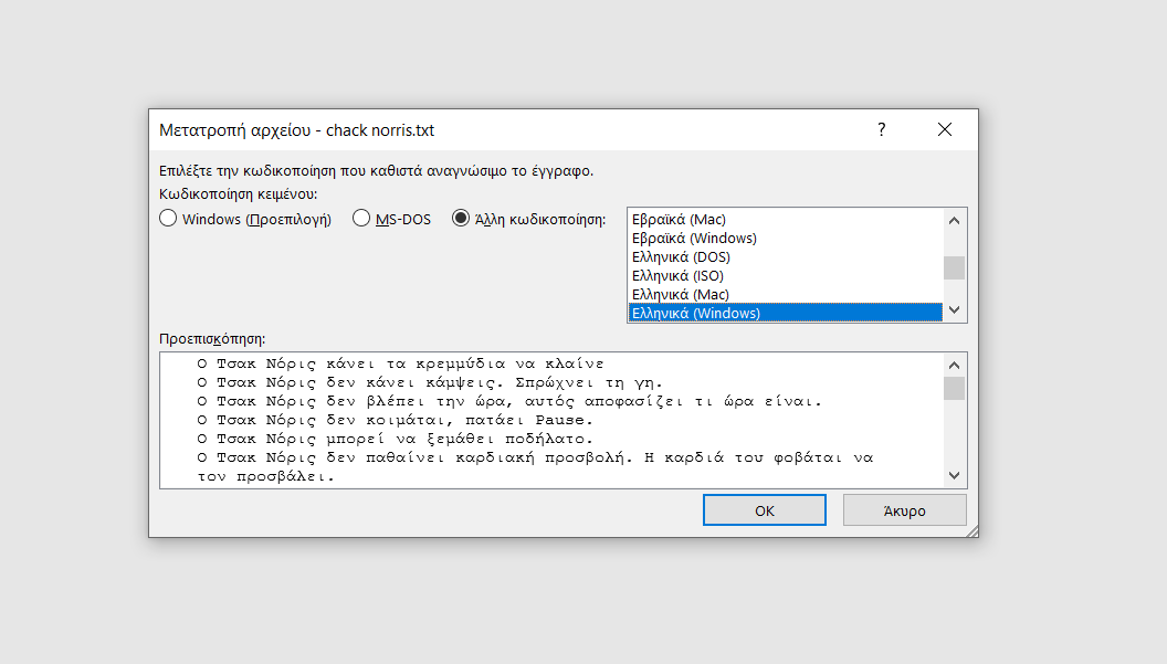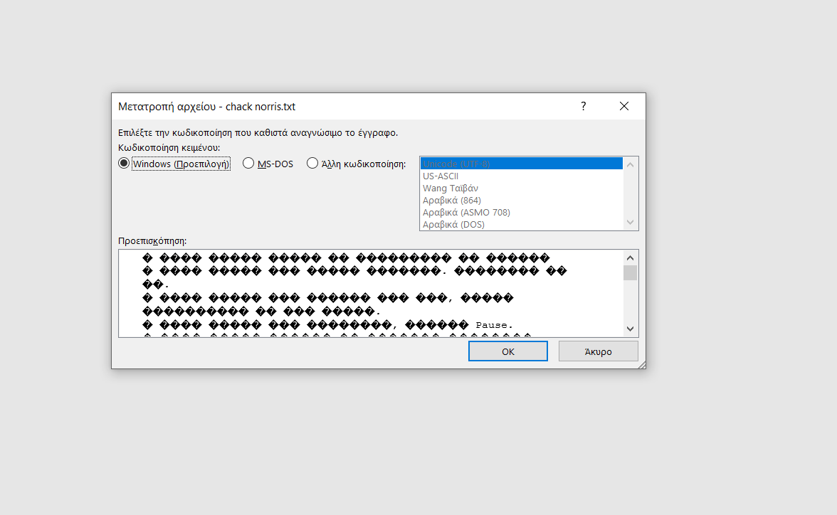 thor777 Δημοσ. 21 Ιανουαρίου 2023 Δημοσ. 21 Ιανουαρίου 2023 Έκανα clean install τα windows 10 (πριν είχα πάλι Windows 10) και όταν ανοίγω .txt αρχεία η Ελληνική γραμματοσειρά (πιθανώς και άλλες γραμματοσειρές πλην της Αγγλικής) είναι πειραγμένη και εμφανίζεται με κάτι ρόμβους με ερωτηματικό ή με τετράγωνα σχήματα ή με ακαταλαβίστικους χαρακτήρες. Αυτό όταν ανοίγω το αρχείο με το notepad ή το wordpad. Τώρα όταν το ανοίγω με MS Word μου βγάζει παράθυρο για μετατροπή του αρχείου. Αν επιλέξω «Windows προεπιλογή» μου βγάζει ρόμβους με ερωτηματικό. Αν επιλέξω «άλλη κωδικοποίηση - Ελληνικά Windows» τότε διορθώνεται το πρόβλημα. Να επισημάνω ότι το πρόβλημα αυτό είναι μόνο στα .txt αρχεία που είχα δημιουργήσει πριν εγκαταστήσω τα Windows. Αν δημιουργήσω τώρα ένα .txt αρχείο και γράψω στα Ελληνικά δεν υπάρχει κάποιο πρόβλημα. Επίσης αρχεία .docx που είχα δημιουργήσει πριν εγκαταστήσω τα Windows ούτε αυτά παρουσιάζουν αυτό το πρόβλημα. Αν ξέρει κάποιος ας αναφέρει ποιες ρυθμίσεις πρέπει να πειράξω για να διορθωθεί το πρόβλημα, ευχαριστώ. Παραθέτω και κάποια screenshot.