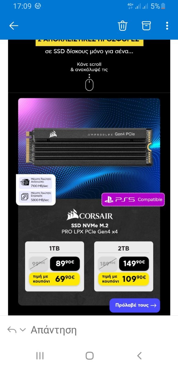 εχω παρει τον 1ΤΒ με 91 ευρω πριν 2 εβδομαδες, ειναι με φουλ ψυκτρα κ χωραει ανετα σε PS5, οι τιμες αν τις πετυχεις ειναι πολυ καλες και για τα δυο μοντελα, απο ποιο μαγαζι σου ηρθε η προσφορα?