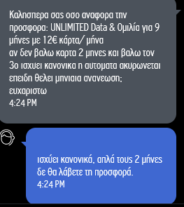 oldnew Δημοσ. 23 Μαρτίου 2023 Δημοσ. 23 Μαρτίου 2023 Το εκανα και εγω μόλις το είδα απο εδω. Thanks! Αν και το cosmote what's up που είχα, είχα μαζεψει 40gb μετα της 10 εως 8 το πρωί, 25 γιγα ολη μερα, 4 μερες απεριόριστο ίντερνετ τα οποία θα πάνε χαμένα.. Ενω το ίντερνετ της βοιδαφον είναι για τα πανηγύρια (ξέρω έχω και αλλη κάρτα). Αλλά είναι απεριόριστο, δε σκέφτεσαι οτι καις data. Κυρίως για ψυχολογικούς λογους το εκανα δηλαδή. Παίζει να έκανα και βλακεια. Και στο what's up 12 καθε μηνα πληρωνα έτσι και αλλιώς. Ξέρει κανείς, υπάρχει όριο στη φορητοτητα? Σε 9 μηνες που θα λήξει το ξανα κανω άνετα what's up αν θέλω ή θα βρω κανένα πρόβλημα? Thanks,