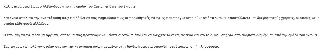 Sebu Δημοσ. 27 Μαρτίου 2023 Δημοσ. 27 Μαρτίου 2023 Ναι γιατι ειναι τυποποιημενη πωλησιακη απαντηση γενικη και αοριστη στη λογικη οτι θα κατευνασει ενα δυσαρεστημενο ή οργισμενο πελατη ή εστω θα δειξει ευγενικη ανταποκριση απο την πλευρα της εταιρειας ανεξαρτητα αν δεν καμφθει η δυσαρεσκεια του πελατη, δεν θα εχει καπου να πατησει δηλαδη σε "ασχημη" συμπεριφορα ή αγενη απάντηση. Πωλησιακες παπατζες, αντι να ασχολουνται ολοι με την ουσια και την πραγματικη ικανοποιηση και τα πραγματικα προβληματα ασχολουνται με το εφε και το φαινεσθαι. 2