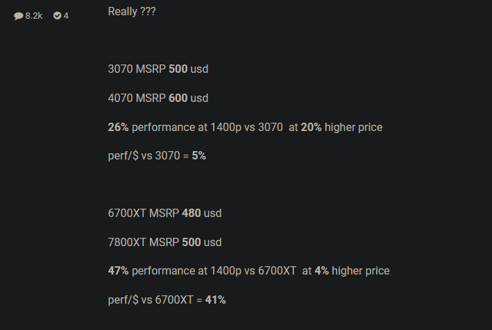 Aten-Ra Δημοσ. 14 Σεπτεμβρίου 2023 Δημοσ. 14 Σεπτεμβρίου 2023 1 hour ago, Herald said: Συνεχίζεις να είσαι άδικος. Κοίταξε, όταν έκανε launch η 7900xt, την σύγκρινα με την 6800xt και διαπίστωσα ότι είχαμε +35% performance με +35% τιμή, άρα 0% αύξηση στο performance per dollar Συνεχώς μου έλεγε συγκεκριμένος χρήστης ότι κακώς τις συγκρίνω, αφού η 7900xt είναι αντικαταστάτης της 6900xt και όχι της 6800xt. Άλλωστε, για να στηρίξει το ορθό της θέσης του, μου έθεσε το αποστομοτικό επιχείρημα "και την 7800xt όταν βγεί με τι θα την συγκρίνεις, με την 6700xt???". A few weeks later Στο δελφινάριο δεν βλέπεις τέτοια, μόνο εδώ Όταν βγήκε η 7900ΧΤ/ΧΤΧ δεν ξέραμε πως θα είναι το υπόλοιπο lineup και υποθέταμε ότι θα βγει 7800ΧΤ στα 650-700 USD. Ξέρεις πριν λίγο καιρό βγήκε η 7900GRE στα 650 USD που είχε η 6800XT, μάλλον το ξέχασες.