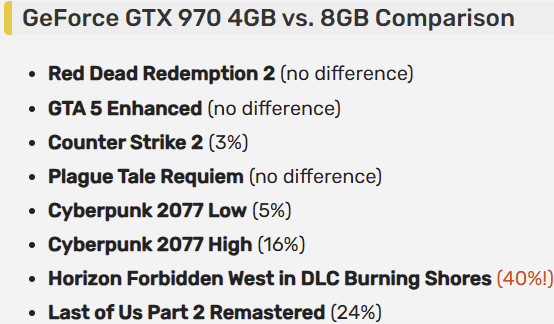 nikos5800 Δημοσ. 27 Μαϊου Δημοσ. 27 Μαϊου 23 ώρες πριν, Fulgore είπε https://videocardz.com/newz/geforce-gtx-970-upgraded-to-8gb-vram-gets-tested-up-to-40-faster-than-stock-model Πάντως τεσταρε που τεσταρε και έκανε τόσο κόπο για το μοδ και πάει και μου το δοκιμάζει στο counter strike,gta5 και red dead 2? Αυτά είναι PS4 games και λογικό να μην έχουν υψηλές απαιτήσεις σε vram,βέβαια στο plague tale requiem μάλλον πρώτα τερματίζει ο πυρήνας πριν φτάσουμε στην μνήμη και γενικά στο 80% των ps5 games λογικά θα τερματίζει πρώτα ο πυρήνας της gtx970. 1