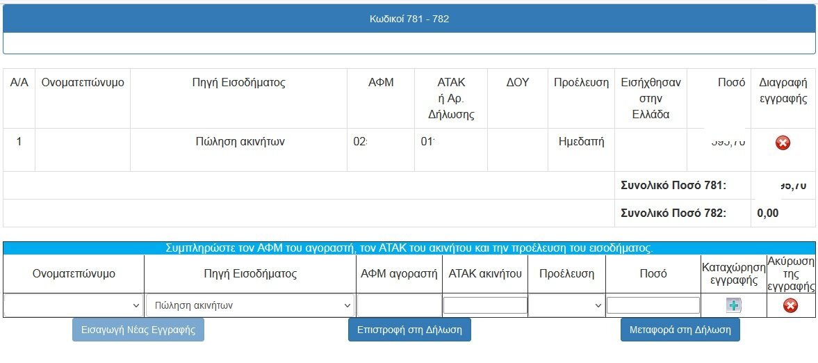 stratos979 Δημοσ. 19 Μαΐου 2023 Δημοσ. 19 Μαΐου 2023 28 λεπτά πριν, mezger είπε Τότε βάλε τι εισέπραξες από την πώληση, στον 781 ξεκίνησα να το φτιάχνω αλλά στο ΑΤΑΚ που λέει, πρέπει να βάλω 3 ΑΤΑΚ (γιατί τόσα δόθηκαν στον αγοραστή) το ποσό όμως δόθηκε για τα 3 ΑΤΑΚ μαζί (ήταν τριόροφο και κάθε όροφος δικό του ΑΤΑΚ) βάζω λοιπόν το κάθε ατακ ξεχωριστά και δίπλα το συνολικό ποσό; μήπως μου χρεώσει το συνολικό ποσό 3 φορές (μία για κάθε όροφο;) αυτό που λέει αντί για ΑΤΑΚ βάλτε αριθμό δήλωσης, μήπως εννοεί τον αριθμό του συμβολαίου; σε ευχαριστώ πολύ