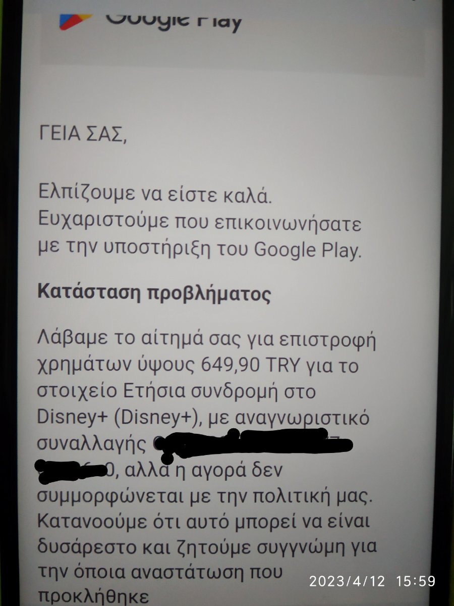 ioannis78 Δημοσ. 12 Απριλίου 2023 Δημοσ. 12 Απριλίου 2023 46 λεπτά πριν, kormos είπε Σε κάποιους έχει αναφερθεί ότι έχει καθυστερήσει η επιστροφή αλλά έχει γίνει... Για να δούμε πόσο θα καθυστερήσει και αν τελικά μου τα επιστρέψουν... Αρχικά την Κυριακή που έγινε η διακοπή, έλαβα το εξής: Και στην συνέχεια σε αίτημα για refund από το google play το εξής: