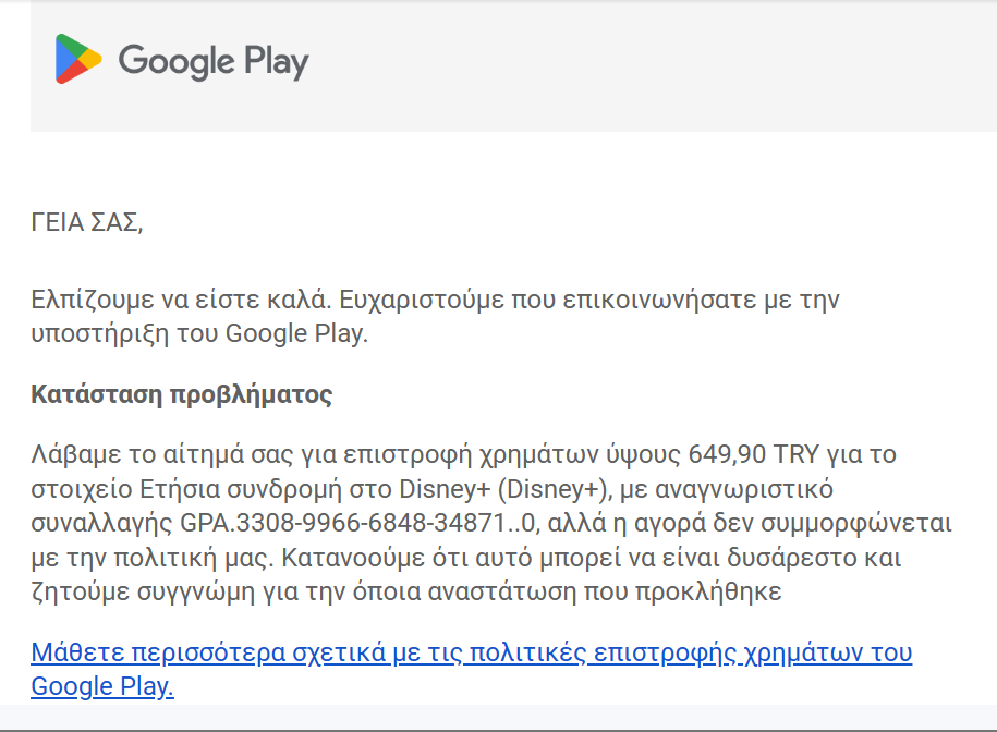 stekon Δημοσ. 22 Απριλίου 2023 Δημοσ. 22 Απριλίου 2023 Στις 20/4/2023 στις 10:06 ΜΜ, sdikr είπε Δοκίμασε να μιλήσεις με Google και πες τους τι γίνεται παιδιά γιατί δεν έχουν επιστρέψει τα χρήματα για αυτή την συναλλαγή στις 27 Φλεβάρη Εστειλα email στην google και ελαβα την παρακατω απαντηση.