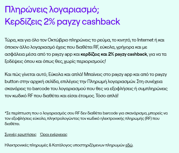 CHRISpros Δημοσ. 1 Νοεμβρίου 2023 Δημοσ. 1 Νοεμβρίου 2023 27 λεπτά πριν, QuantumDot είπε 1η Νοεμβρίου σήμερα. Καλό μήνα κιόλας! Πλέον δεν ισχύει η επιστροφή 2% για πληρωμές με RF, έτσι; Παίζει (ή...payzy χαχα) να πάρει νέα παράταση; Ισχύει και για τον Νοεμβριο. Πήρε παράταση, έχουν ανανεωθεί και οι όροι "Η διάρκεια της Προωθητικής Ενέργειας ορίζεται από 01/06/2023 έως και 30/11/2023" 2