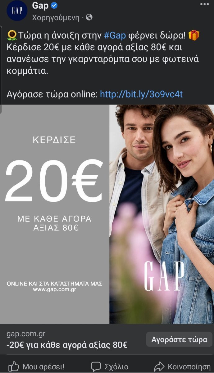 carolosjk Δημοσ. 20 Απριλίου 2023 Δημοσ. 20 Απριλίου 2023 (επεξεργασμένο) Δίνει και 5€ επιστροφή το payzy αν κάνεις αγορές στο site των GAP πάνω από 70€ (μετά την έκπτωση) που λέει συνδυάζεται με προωθητικές ενέργειες του GAP. Άρα αν αγοράσει κάποιος κάτι με πχ. 100€ έχει -20€ από τα GAP και 5€ επιστροφή από payzy. Edit: Βλέπω οτι και οι 2 προσφορές ισχύουν και στα φυσικά καταστήματα, και τα -20€ και τα 5€ επιστροφή, που αξίζει για να δοκιμάσει κανείς και τα ρούχα πριν τα πάρει. Επεξ/σία 20 Απριλίου 2023 από carolosjk 1