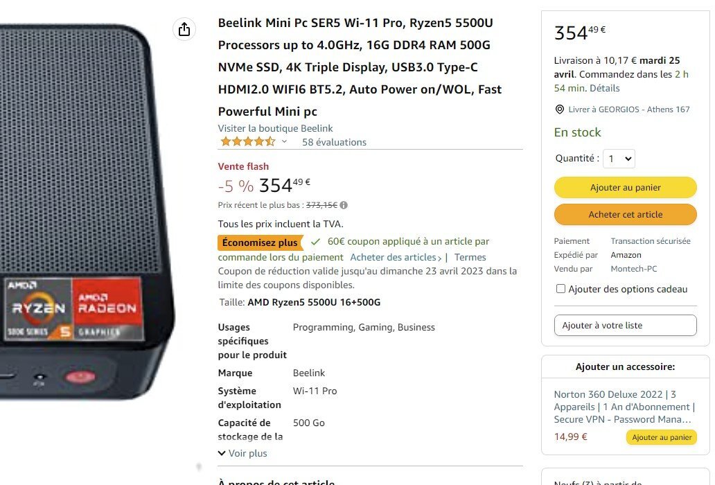 venuets Δημοσ. 18 Απριλίου 2023 Δημοσ. 18 Απριλίου 2023 Mini PC Beelink SER5 (Ryzen 5 5500U / 16GB / 500GB / Windows 11 Pro) 316.48 € https://www.amazon.fr/dp/B0B81TCWB7 Την τιμή την πετυχαίνουμε με την χρήση κουπονιού! (κλικαρουμε το κουτάκι) Ανταγωνισμός από 462€ σε Skroutz και Bestprice 6 1