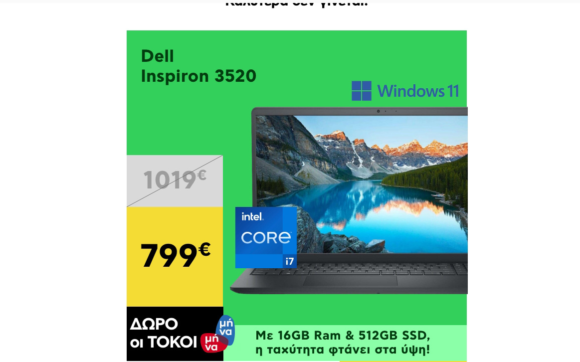 venuets Δημοσ. 5 Μαΐου 2023 Δημοσ. 5 Μαΐου 2023 (επεξεργασμένο) Dell Inspiron 3520 15.6 (i7-1255U/16GB/512GB SSD/W11 Home) 799 € https://www.plaisio.gr/pc-perifereiaka/laptops/windows-laptops/dell-inspiron-3520-laptop-15-6-full-hd-core-i7-1255u-16-gb-512-gb-iris-xe-graphics-windows-11-home-_4154444 Ανταγωνισμος απο 985€ https://www.skroutz.gr/s/38753152/Dell-Inspiron-3520-15-6-i7-1255U-16GB-512GB-SSD-W11-Home-Carbon-Black-US-Keyboard.html Επεξ/σία 5 Μαΐου 2023 από venuets 1