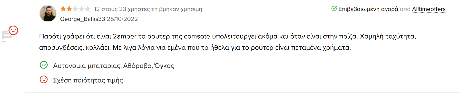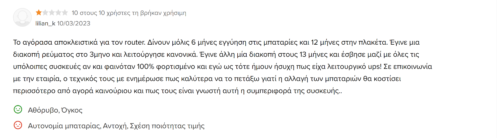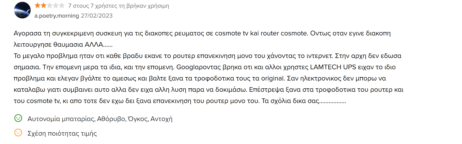 maltron66 Δημοσ. 22 Ιουνίου 2023 Δημοσ. 22 Ιουνίου 2023 (επεξεργασμένο) Καλησπέρα, παιδιά. Ψάχνω για UPS για το router μου, συγκεκριμένα για το Speedport Plus 2 της Cosmote. Έχω ψάξει ήδη στο forum και αρκετοί χρήστες προτείνουν το Lamtech Mini των 30W, το οποίο έδινε παλαιότερα η ίδια η Cosmote. Αλλά παρόλο που οι κριτικές στο Skroutz είναι στη πλειοψηφία τους θετικές, ορισμένοι χρήστες αναφέρουν προβλήματα, όπως η περιορισμένη ζωή των μπαταριών, αλλά και ελαττωματική λειτουργία της συσκευής που συνοδεύεται με επανεκκινήσεις, αποσυνδέσεις και χαμηλές ταχύτητες στο router. Μπορεί κάποιος που να έχει τη συγκεκριμένη συσκευή για ένα σχετικά μεγάλο χρονικό διάστημα να μου πει αν η συγκεκριμένη συσκευή παρουσιάζει τέτοια προβλήματα; Είναι αξιόπιστη ή έχετε να μου προτείνετε κάποιο άλλο UPS; Ευχαριστώ εκ των προτέρων! Επεξ/σία 22 Ιουνίου 2023 από maltron66