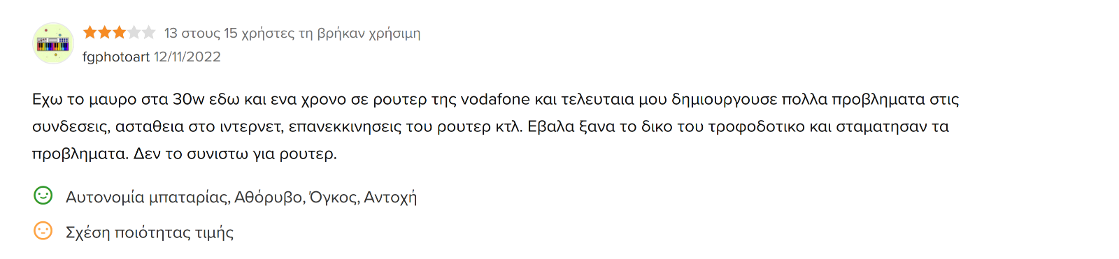 maltron66 Δημοσ. 22 Ιουνίου 2023 Μέλος Δημοσ. 22 Ιουνίου 2023 25 λεπτά πριν, tarantules είπε Το 1ο Lamtech των 18w το πήρα δώρο από την cosmote το 2020.Έκτοτε είναι συνδεδεμένο πάνω σε ένα Fritzbox 7530 και παίζει απροβλημάτιστα.Σε 2 διακοπές ρεύματος των 3 ωρών που έχουν συμβεί δεν παρατήρησα την παραμικρή αστάθεια.Έχω κάνει και τέστ αντοχής και βγάζουν άνετα οι μπαταρίες πλέον των 7 ωρών.Αγόρασα και την έκδοση των 30w σαν 2ο να το έχω σαν power bank ανάγκης. Σε ευχαριστώ, φίλε. Απ' ότι φαίνεται, τα προβλήματα που ανέφερα παραπάνω είναι μάλλον εξαιρέσεις και όχι ο κανόνας. Μάλλον θα το τσιμπήσω, εκτός κι αν βρεθεί κάποιος που να έχει καμιά καλύτερη πρόταση.