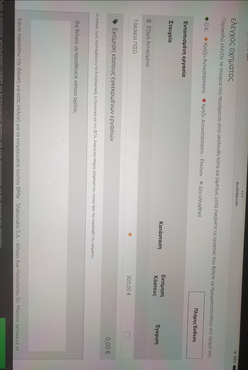 mike15 Δημοσ. 17 Σεπτεμβρίου Δημοσ. 17 Σεπτεμβρίου (επεξεργασμένο) παρτε μια ιδεα απο την αντιπροσωπεια για το value service, ειναι πακετο εκπτωτικο προσφορα που δινεται σε παλια μοντελλα https://bmw-spanos.gr/index.php?option=com_content&view=article&layout=edit&id=25 Αντικατάσταση δίσκοι και τακάκια μπροστινών φρένων. Εργασίες service που περιλαμβάνονται στο πακέτο Όλες οι εργασίες service που αναφέρονται παρακάτω εκτελούνται από τους έμπειρους ειδικούς του BMW Service. Αφαίρεση των μπροστινών τροχών, των δίσκων φρένων και των τακακιών Επιθεώρηση του συστήματος πέδησης, συμπεριλαμβανομένων των σωλήνων φρένων Καθαρισμός των μπροστινών φρένων Τοποθέτηση των μπροστινών τροχών Τοποθέτηση των καινούριων δίσκων, τακακιών φρένων και αισθητήρων Μοντέλο Τιμή 116i €310 118d €315 118i €310 120d €325 120i €325 123d €390 130i €390 Αντικατάσταση τακάκια μπροστινών φρένων. Εργασίες service που περιλαμβάνονται στο πακέτο Όλες οι εργασίες service που αναφέρονται παρακάτω εκτελούνται από τους έμπειρους ειδικούς του BMW Service. Αφαίρεση των μπροστινών τροχών και των τακακιών Επιθεώρηση του συστήματος πέδησης, συμπεριλαμβανομένων των σωλήνων φρένων Σχολαστικός καθαρισμός των μπροστινών φρένων Τοποθέτηση των καινούριων τακακιών Τοποθέτηση των μπροστινών τροχών Μοντέλο Τιμή 116i €150 118d €155 118i €155 120d €160 120i €160 123d €175 130i €175 εγω για αυτα τα τακακια,ΑΤΕ , που ειναι και η καλυτερη μαρκα ΟΕΜ, εδωσα για αγορα 60 ευρω περιπου και 30 εργατικα,8 το σωληνακι,ετσι εμειναν 50 ευρω στο χερι σε συγκριση με την αντιπροσωπεια. αλλα αυτοι εχουν τους "ειδικους" εκει..πρεπει να πληρωνονται αναλογα. φυσικα ο τεχνιτης μου δεν εχει σαλονακι με καφε,ουτε την κλασατη γραματεα,λογιστη,ουτε ντιζαιν συνεργειου καλατραβα .. αυτα πληρωνεις εκει Επεξ/σία 17 Σεπτεμβρίου από mike15