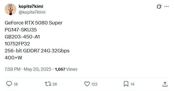 Sarandis Δημοσ. 20 Μαϊου Δημοσ. 20 Μαϊου (επεξεργασμένο) Aυτό δεν ίδιο με την 5080 απλά με παραπάνω vram; https://x.com/kopite7kimi/status/1924872264996311276 Επεξ/σία 20 Μαϊου από Sarandis
