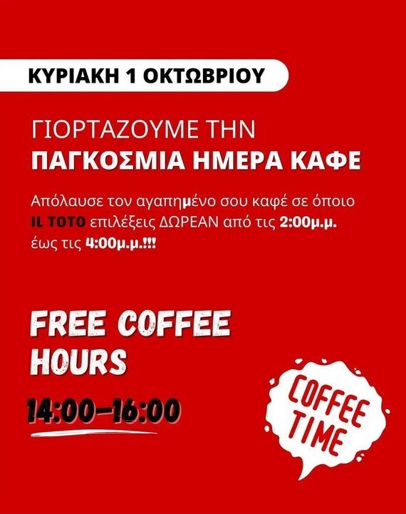 mr.mister Δημοσ. 1 Οκτωβρίου 2023 Δημοσ. 1 Οκτωβρίου 2023 (επεξεργασμένο) Δωρεάν καφέ απο τα καταστήματα Il Toto σημερα 14:00 με 16:00 για την Παγκόσμια Ημέρα Καφέ. Ισχύει μόνο για Take Away και όχι Delivery! Επεξ/σία 1 Οκτωβρίου 2023 από mr.mister 1