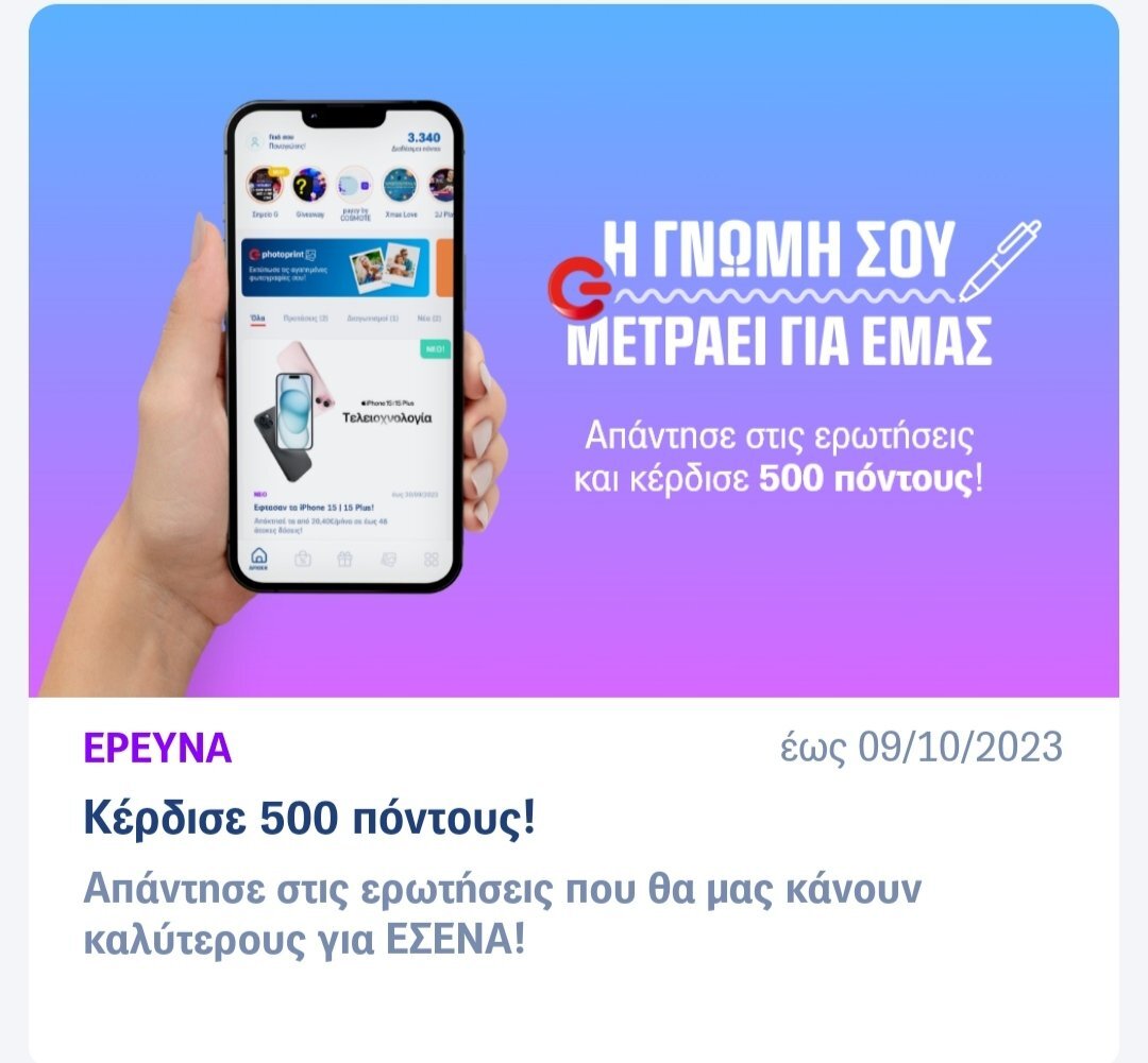 ison Δημοσ. 2 Οκτωβρίου 2023 Δημοσ. 2 Οκτωβρίου 2023 4 ώρες πριν, tonis1989 είπε Germanos G app: 500 πόντοι δίνει στην συμπλήρωση της έρευνας μέσα στην εφαρμογή. Η έρευνα είναι στην αρχική σελίδα του G app. 200 έξτρα αν αξιολογήσετε στο Google Play ακριβώς μετά το πέρας της έρευνας. 500 με τον προωθητικό κωδικό gappstorespromo Μενού --> Συλλογή πόντων --> Προωθητικός κωδικός Συμπλήρωση έρευνας έως 09/10/2023. Ο κωδικος μια χαρα δουλευει τσιμπησα τους 500 ποντους...την ερευνα ομως δεν μου την βγαζει για καποιο λογο (εχω κανει ηδη αξιολογηση στο store)..μου εχει ερθει και το mail αλλα ερευνα γιοκ (και οχι τπτ αλλο θελω 400 ποντους για να παω 10.000)