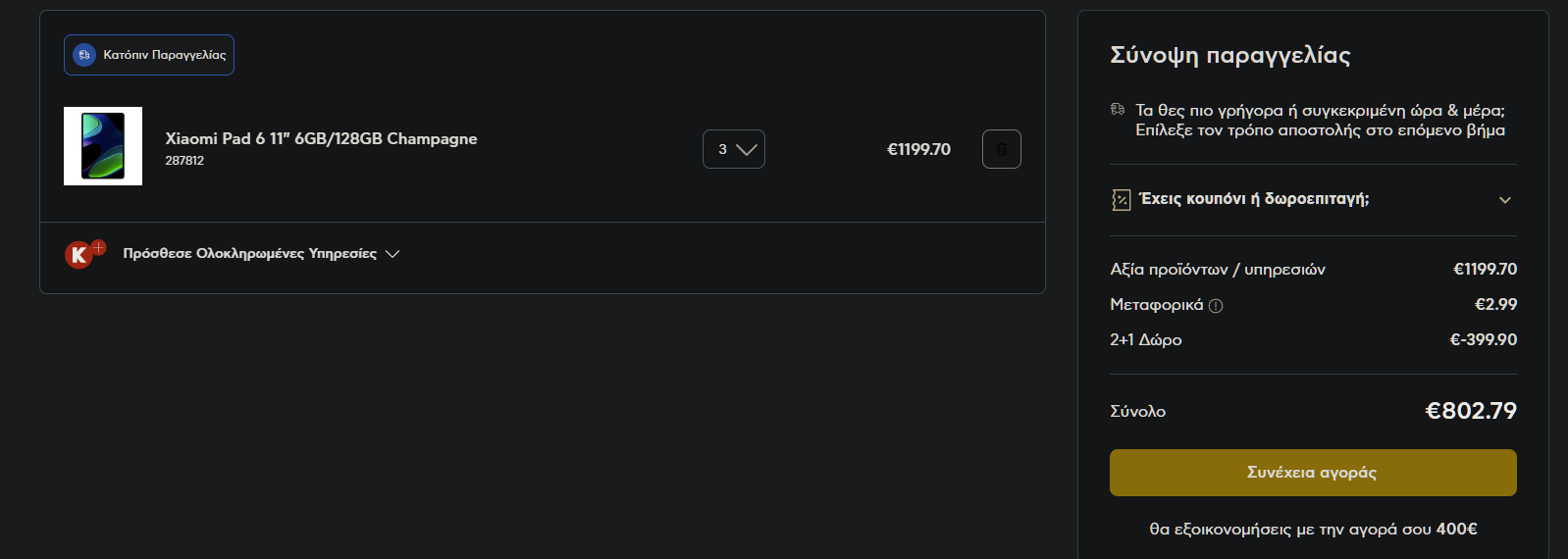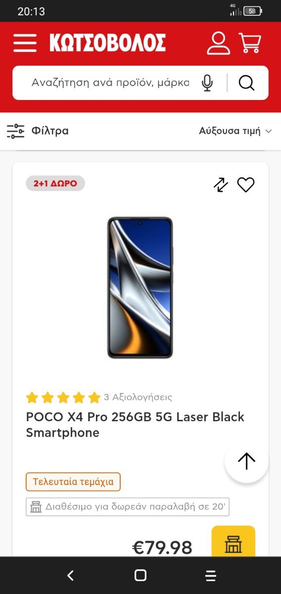 yiankap Δημοσ. 4 Νοεμβρίου 2023 Δημοσ. 4 Νοεμβρίου 2023 (επεξεργασμένο) Καλά είναι πολύ ............ Παρήγγειλα 3 screen protector στα 0,99 € (2+1 free - σύνολο 1,98) και επιλέγω παραλαβή από κατάστημα. Βάζω ΤΚ και μου βγάζει ότι μπορώ να παραλάβω το ένα μόνο προϊόν από το κατάστημα διπλανού Νομού όπου και είναι διαθέσιμο... Ότι να ναι.... Άρα για να είναι 2+1 πρέπει και τα τρία προϊόντα να είναι διαθέσιμα στο ίδιο κατάστημα ή τουλάχιστον στην αποθήκη..... Ο Γερμανός είναι σαφώς ανώτερος...Στα φέρνει στο κατάστημα της πόλης σου από οποιοδήποτε κατάστημα της Ελλάδας.... Επεξ/σία 4 Νοεμβρίου 2023 από yiankap
