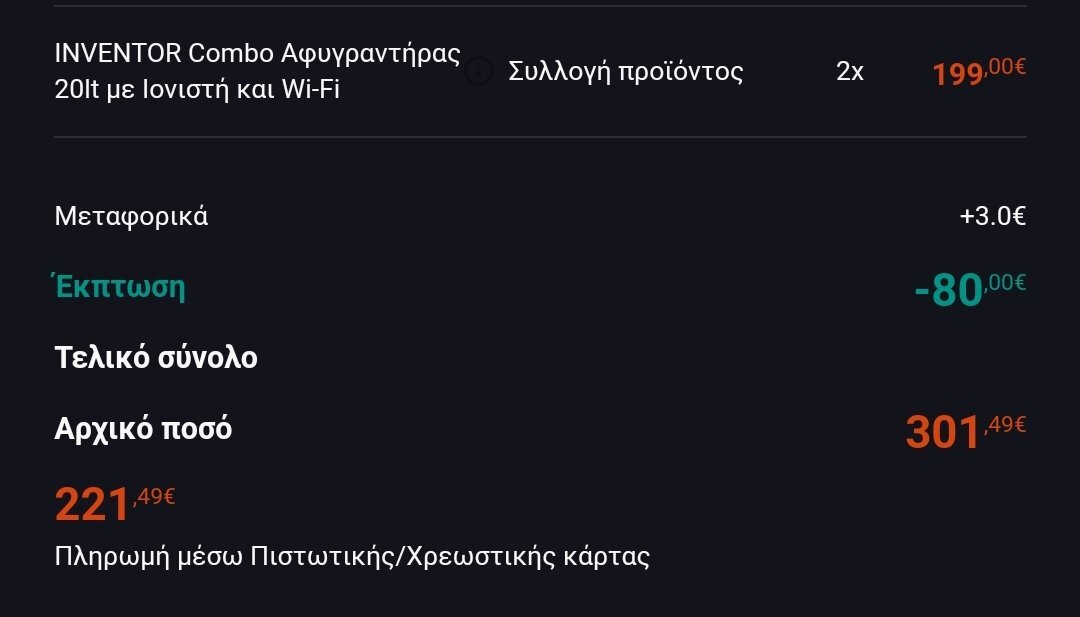 mariosdemigod Δημοσ. 23 Νοεμβρίου 2023 Δημοσ. 23 Νοεμβρίου 2023 6 ώρες πριν, basilis_k6 είπε αφου δεν συνδιάζεται με δωροεπιταγη!? αλλο το κουπονι αλλο η δωροεπιταγη? εντωμεταξυ λες πηρες αφυγραντηρα και λεει δεν συνδιάζεται με άλλη εκπτωση και οι μισοι στο σαιτ ειναι ηδη σε εκπτωση. πως το εκανες το μαγικο? Ήθελα να πάρω τον αφυγραντήρα: INVENTOR Combo Αφυγραντήρας 20lt με Ιονιστή και Wi-Fi στα 200€ τιμή σάιτ. Περίμενα να δω αν θα παίξει καμία έξτρα προσφορά και με αφορμή τη χθεσινή έβαλα 2 τεμάχια παραγγελία. Έβαλα 2 αφυγραντήρες και το καλάθι έγραφε 300 αντί για 400€. Έβαλα και το κουπόνι μου κανονικά και τελικά πλήρωσα 220€ για τους 2 μαζί.