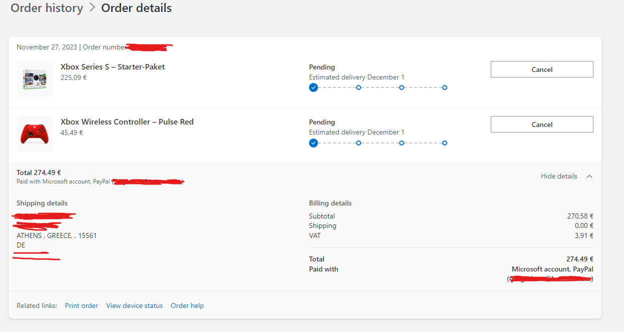 G@rg@oun Δημοσ. 27 Νοεμβρίου 2023 Δημοσ. 27 Νοεμβρίου 2023 Eνα HELP.. Εκανα μια αγορά τώρα από το microsoft.de Εβαλα Greece χωρα πριν το check out..την εμφανιζε κανονικά. Εβαλα διευθυνση Ελλαδας..τκ κλπ. Πληρώνω και σκάει το Invoice και γράφει ότι η πληρωμή έγινε ολα οκ<είδα και την χρέωση> και στο Shipment γράφει την διεύθυνσή μου που έβαλα και μετά από κάτω γράδει ένα "DE" Delivery 1-12-2023..πρώτον πολύ γρήγορο δεν είναι και δεύτερον δεν πιστεύω να το πάει πουθενά στην Γερμανία. Έχει τύχει σε κάποιον κάτι ανάλογο?