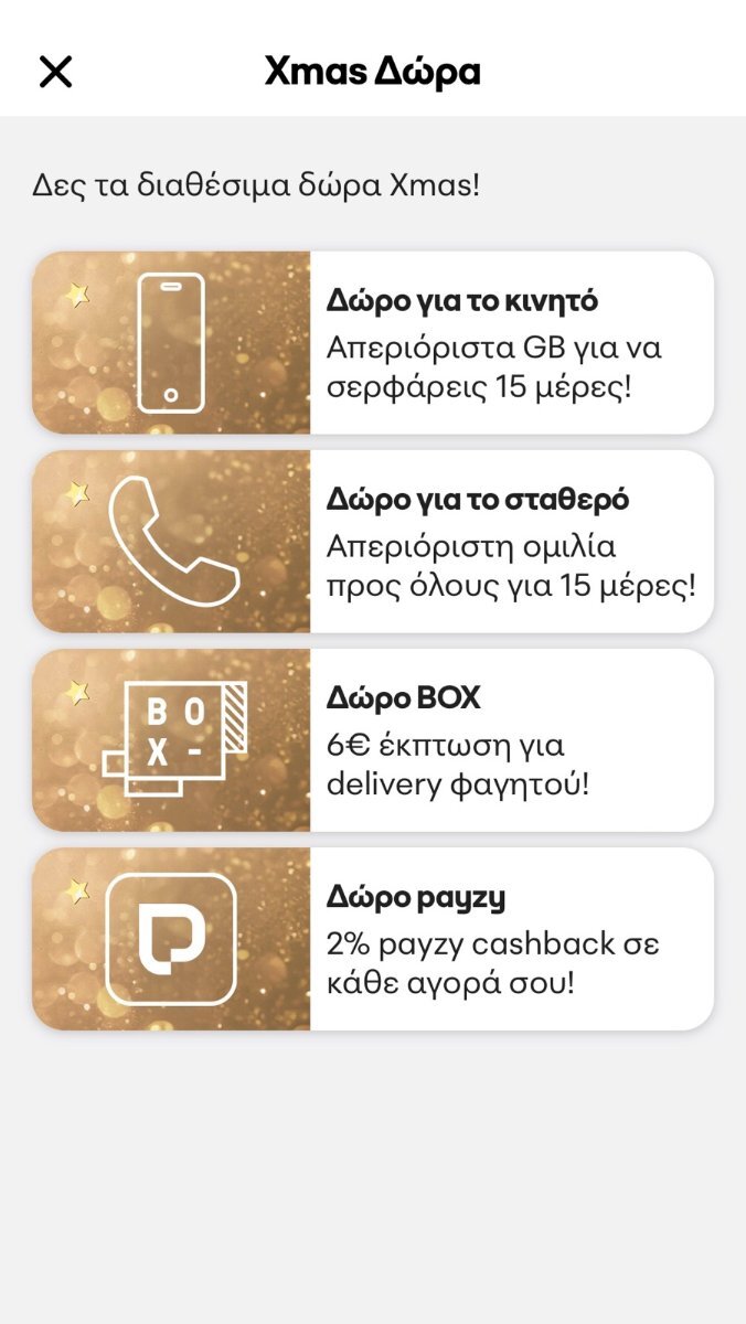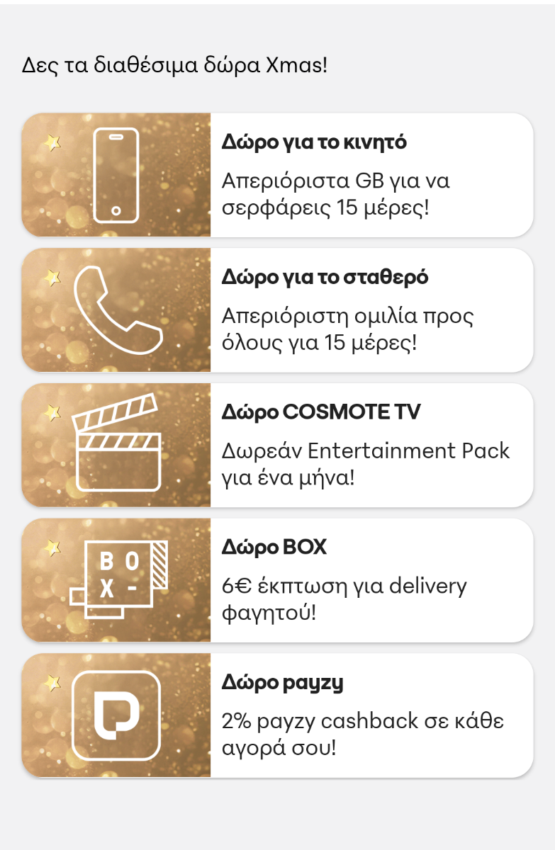 Δημοφιλής ανάρτηση panos- Δημοσ. 12 Δεκεμβρίου 2023 Δημοφιλής ανάρτηση Δημοσ. 12 Δεκεμβρίου 2023 (επεξεργασμένο) Και φέτος δώρα μέσω του Cosmote App: - Απεριόριστα δεδομένα για 15 μέρες, ενεργοποίηση μέχρι 2/1 και χρήση εντός Ελλάδος μόνο. Για τα καρτοκινητά χρειάζεται ανανέωση μετά τις 15/11. - Δωρεάν Cosmote tv entertainment pack. Ενεργοποίηση μέχρι 2/1. Για συνδρομητές Cosmote μέσω του App. Για τους μη συνδρομητές, στέλνετε μήνυμα στην φόρμα όπως λέει εδώ Απο αναφορες μελων, δεν το δινουν σε ολους αλλα ισως τυχαια σε καποιους; Αγνωστο. Spoiler Μπορείς να επικοινωνήσεις μαζί μας από τις 12/12/2023 έως τις 2/1/2024 συμπληρώνοντας την Φόρμα Επικοινωνίας με θέμα “XMAS – COSMOTE TV”, όπου θα μας εκδηλώσεις το ενδιαφέρον σου για να σου σταλούν αναλυτικές πληροφορίες για την απόκτηση του δώρου. - Κουπόνι box “ XMAS3 “ για 3€ έκπτωση σε 2 παραγγελίες, τουλάχιστον 8€ αρχική αξία η κάθε μια τους και πληρωμή μόνο με κάρτα - Απεριόριστα λεπτά για Ελλάδα για 15 μέρες σε συνδρομητές σταθερής. Ενεργοποίηση μέχρι 2/1. Περιορισμός 2 πακέτα ανά ΑΦΜ και 1 φορά ενεργοποίηση ανά σύνδεση σταθερού Όλες οι προσφορές και οι όροι εδώ Επεξ/σία 24 Δεκεμβρίου 2023 από matrixxx τροποποιηση για το cosmote TV 21 12