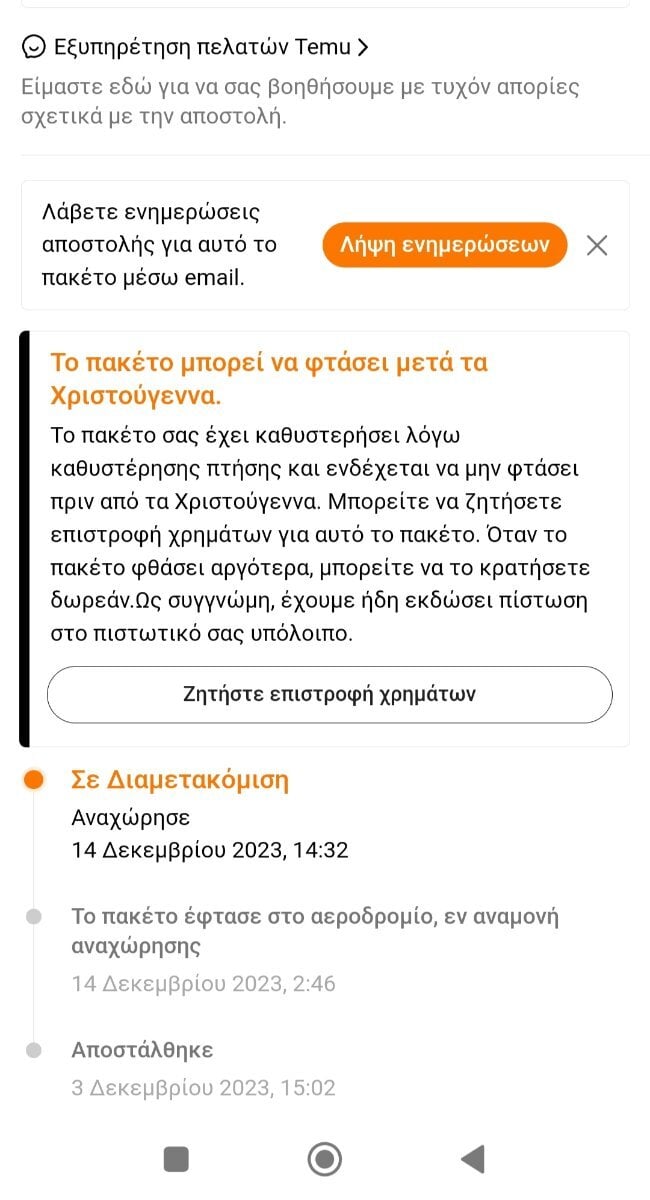 NIKOLETAL Δημοσ. 16 Δεκεμβρίου 2023 Μέλος Δημοσ. 16 Δεκεμβρίου 2023 43 λεπτά πριν, fmarkos είπε Αν ζητήσεις επιστροφή χρημάτων θα ακυρωθεί και η παραγγελία σου προφανώς. Μα γράφει ότι αν ζητήσω επιστροφή χρημάτων μπορώ να κρατήσω το πακέτο όταν φτάσει αργότερα. Στην κατάσταση παραγγελίας γράφει ότι έχει ήδη αποσταλεί.