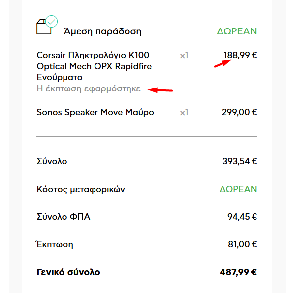 plr77 Δημοσ. 26 Δεκεμβρίου 2023 Μέλος Δημοσ. 26 Δεκεμβρίου 2023 (επεξεργασμένο) Κοιταξτε εβαλα ενα πληκτρολογιο που ηθελα της corsair και εβαλα επιτηδες μια τιμονιερα ακριβοτερη.Μου εκανε 30% στο πληκτρολογιο το οποιο κοστιζει 270 ευρω...Εχει μεσα ολα τα ακριβα ποντικια corsair razer ,πληκτρολογια και γενικα και σε αλλα προιοντα. 52 λεπτά πριν, matrixxx είπε Οπως εχει αναφερθει και στο θεμα του xbox στα 439 πριν 10 ημερες, το 10% ισχυει σε αγορες ανω των 499€ και ΜΟΝΟ με πιστωτικες καρτες. Στις χρεωστικες ΔΕΝ ισχυει ανεξαρτητως ποσου. @ all Παντως και εγω που χαλασα μιση ωρα μπας και βρω κατι αξιο λογου, δεν βρηκα τιποτα σε οσες κατηγοριες προιοντων με ενδιεφεραν και θελω να κανω αγορα. Δεν θα ανοιγα θεμα λοιπον αφου δεν εχω βρει κατι με 10% διαφορας απο τον ανταγωνισμο (με υπολογισμενο το -30% εννοειται. Αν καποιος βρει να το ποσταρει αν θελει, αλλωστε αυτο λεμε και στις οδηγιες προ δεκαετιας : Δεν επιτρεπονται τα newsletters ως νεα θεματα. Αν βρειτε σε ενα newsletter προσφορα πραγματικη ανοιγετε θεμα για την προσφορα. Αν οχι, δεν κανετε τιποτα. ) Θα σου δωσω ενα παραδειγμα.https://www.bestprice.gr/item/2156420882/corsair-k100-opx-silver-mhxaniko-gaming-plhktrologio-me-corsair-opx-diakoptes-rgb.html?qo=100&from=cat και https://www.bestprice.gr/item/2155769251/sonos-move1eu1-move-black.html?qo=move&from=cat.βγαινουν κοντα στα 580 ευρω και χαμηλοτερη τιμη απο καταστημα μη ποιστοπιημενο το ηχειο αλλα και παλι. στο πλαισιο βγανουν 487 ευρω σου κατεβαζει 81 ευρω απο το πληκτρολογιο.Το ηχειο το εβαλα τυχαια οποτε συμφερει απο πλαισιο ενας που θελει και τα δυο ειναι 90+€ κατω.Εχει παρα πολλα προιντα παιδια απλα σας εγραψα ελεγχεται τιμες οχι σε ολα φυσικα σε αυτα που σας ενδιαφερουν μονο. 1 ώρα πριν, gogkroj είπε δηλαδη -15% σε καθε προιον με ιδια αξία ? ρε παιχταρα μου σε 2 ιδια προιοντα -30% θα ειναι σε ενα απο τα δυο που στην ουσια ειναι -15% απο το καθενα προφανως Επεξ/σία 26 Δεκεμβρίου 2023 από plr77 1