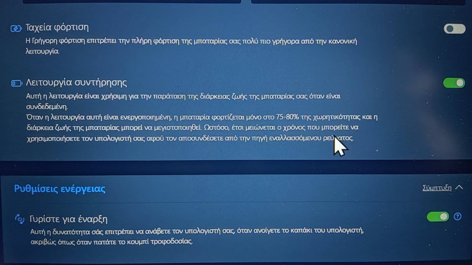 00 George 00 Δημοσ. 25 Φεβρουαρίου 2024 Μέλος Δημοσ. 25 Φεβρουαρίου 2024 (επεξεργασμένο) Ευχαριστώ πολύ το έκανα . Και μία ακόμα ερώτηση , το ποσοστό της μπαταρίας πως αλλάζει.... γιατί φορτίζει μέχρι το 80% και σταματάει , μπορώ να το αλλάξω π.χ. στο 50% να σταματάει ?? Η ρυθμίσεις που δείχνει η lenovo για την αλλαγή του ποσοστού μπαταρίας δεν υπάρχουν στο πρόγραμμα που έχω . . https://support.lenovo.com/us/en/solutions/vid500054 Επεξ/σία 25 Φεβρουαρίου 2024 από 00 George 00