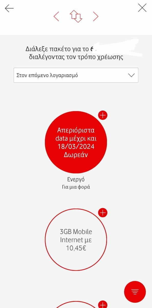 Με το που ανοίγει η εφαρμογή της Vodafone, κλικ στο κόκκινο κουμπάκι "Πακέτα", κάτω από το υπόλοιπο των sms. Ανοίγει το μενού για αγορά data και δίνει 1η επιλογή το "Απεριόριστα data μέχρι και 18/03/2024 Δωρεάν".