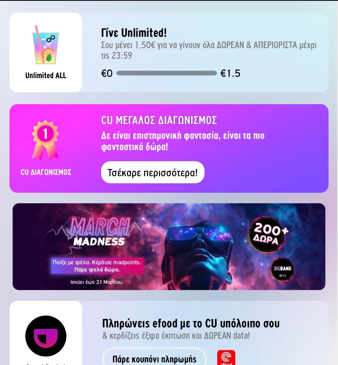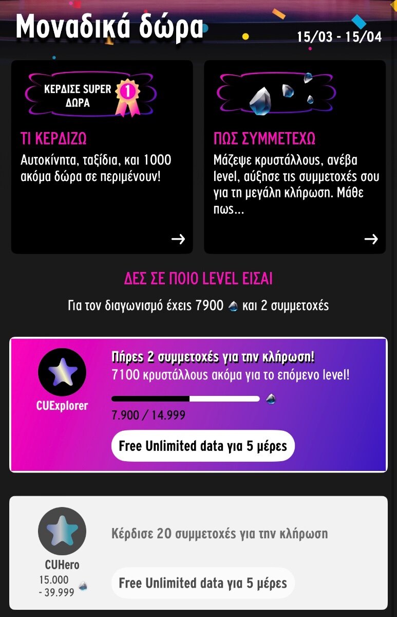 Βλακείες σου είπαν, κάνε update το cu app και πας στο cu μεγάλος διαγωνισμός στη κεντρική σελίδα της εφαρμογής και πάρε unlimited για 5 μέρες.