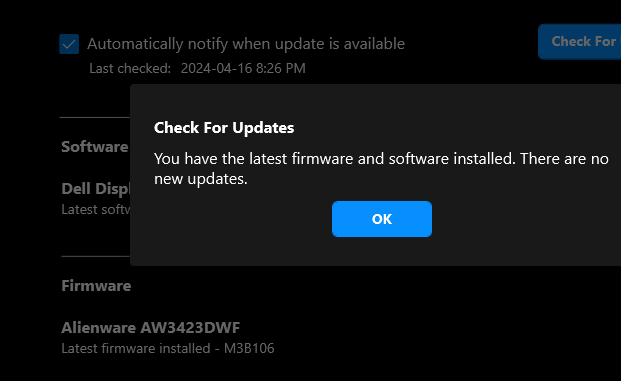 Arkin Δημοσ. 16 Απριλίου 2024 Μέλος Δημοσ. 16 Απριλίου 2024 (επεξεργασμένο) 18 λεπτά πριν, totomis είπε Βγήκε καινούριο firmware... Το έβαλε κανείς να μας πει διάφορες; Δεν εχει ερθει ακομα ΟΤΑ με βγαζει αυτο και εχω το τελευταιο 106. Το κατεβαζω τωρα απο εδω. https://www.dell.com/support/home/en-uk/drivers/driversdetails?driverid=892hj&oscode=w2021&productcode=aw3423dwf-monitor Εδω τα fixes Fixes & Enhancements 1. Fix synchronization issue between DDM and OSD 2. Update HDR behavior 3. Fix issue of monitor shows different sharpness effect between left and right side of screen. 4. Clarify warning message due to thermal behavior Επεξ/σία 16 Απριλίου 2024 από Arkin 1