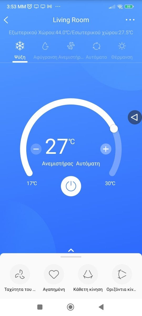 Λειπαμε ενα 2ημερο απ το σπιτι οποτε μεσα επιασε 32 βαθμους..Ξεκινησα το 18αρι Haier στο καθιστικο και το daikin 25 στην κουζινα ζητηση 27& 28 αντιστοιχα fun3 και τα 2..Επειδη εβλεπα πως δεν πεφτει ευκολα η εσωτερικη και το haier κολλημενο στα 1500w (μαλλον λογικο αφου τα παντα ζεσταθηκαν)  ανεβασα  τη ζητηση κι αυτο στα 28 με τη λογικη να πεσει σταδιακα η θερμοκρασια χωρις να καψει πολυ και πιο μετα να το κατεβασω στο 27..Δε ξερω αν αυτο ειναι το σωστο, θα δειξει τωρα εχω 28,2 κατω απ το κλιματιστικο, ενω πιο μακρια στην τραπεζαρια 28,7. Τραβαει απο 450-500w. Εξωτερικη τωρα 42 με ζεστο αερα, ενω το μεσημερι ηταν καλυτερα..Πολυ δυσκολες συνθηκες! Πιο μετα θα το παω 27 να δουμε και θα μεινει συνεχεια ανοιχτο!