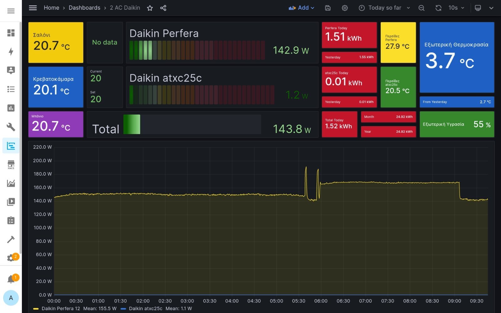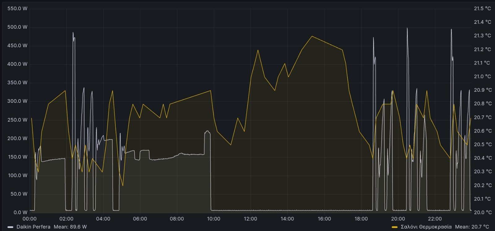 Σε λειτουργία έχω μόνο το κλιματιστικό στο σαλόνι καθώς και μόνο του με ζήτηση 20.5 βαθμούς διατηρεί στο σαλόνι θερμοκρασία από 20.5 έως 21.5 και στην κρεβατοκάμαρα από 20 έως 21 , οπότε και δε χρειάστηκε να λειτουργήσω και το κλιματιστικό στην κρεβατοκάμαρα.