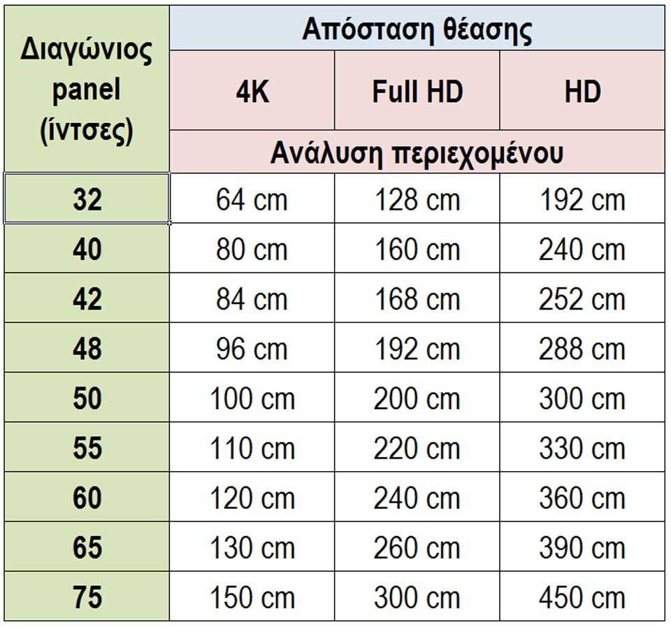 cabdik Δημοσ. 26 Απριλίου 2024 Δημοσ. 26 Απριλίου 2024 (επεξεργασμένο) επειδη βλεπω οτι πολυς κοσμος εχει κολλησει στις ιδανικες αποστασεις θεασης, και νομιζουν οτι στα 2-3 μετρα "πρεπει" να εχεις 55-60-65" τηλεοραση, να σας διευκρινισω οτι ειστε εντελως αλλου. αυτες οι αποστασεις... ΔΕΝ σημαινουν οτι σε συγκεκριμενη αποσταση ΠΡΕΠΕΙ να παρεις χ ιντσες...! απλα σημαινει οτι ειναι η ελαχιστη αποσταση που θα βλεπεις καθαρη εικονα, χωρις να διακρινεις τα Pixel...! ΕΛΕΟΣ δλδ με τις 65αρες στα 2 μετρα..........!!!!! ο παρακατω πινακας διεχνει αναλογα με την αναλυση τις "ιδανικες" αποστασεις...! δειτε σε ιδιες ιντσες τις διαφορετικες αποστασεις....... γιατι....??? Επεξ/σία 26 Απριλίου 2024 από cabdik 1