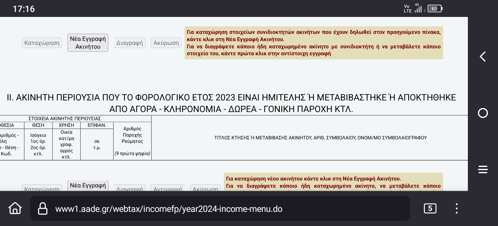 Krusty Δημοσ. 12 Ιουνίου 2024 Δημοσ. 12 Ιουνίου 2024 1 ώρα πριν, airtrelomike13 είπε Αν έχει γίνει γονική παροχή το 2023, με ψιλή κυριότητα και επικαρπία, θα πρέπει να δηλωθεί πέρα από το Ε9 και στο Ε1 κάπου ή όχι? Δες τον πίνακα 2 στο Ε2. Εμένα η λογιστρια μού είπε οτι πρεπει να συμπληρωθεί η κληρονομιά του χρόνου. Στις 10/6/2024 στις 9:55 ΠΜ, kkaragki είπε Καλημέρα, Έχω ένα πρόβλημα με το να δηλώσω το νέο μισθωτήριο (ανανέωση) που σύναψα με τον σπιτονοικοκύρη μου τον Δεκέμβριο. Προσπαθώ να δηλώσω στους 11 μήνες το "παλιό" ενοίκιο και στον 1 μήνα το "καινούργιο" ενοίκιο. Αυτό που μου βγάζει το σύστημα είναι το παρακάτω: Απόκρυψη περιεχομένων Μου φαίνεται πολύ περίεργο να μην υπάρχει μια στάνταρ διαδικασία για το συγκεκριμένο θέμα. Όσο κι αν έχω ψάξει, δεν έχω βρει κάπου που να απαντάται ξεκάθαρα. Εμένα την μητέρα μου που είναι εκμισθωτής, αντί να έχει δύο γραμμές με τον ίδιο μισθωτή στο Ε2 της, έχει μία στην προσυμοληρωμένη Ε2 δήλωση. Και γράφω δύο γιατί στις 1/6 έγινε τροποποίηση-ανανέωση του μισθωτηρίου και θα μπορούσε να είχε αλλάξει και το ενοίκιο. Έχει προσυμπληρωμένη μία γραμμή λοιπόν και αναγράφει απο 1/6 έως 31/12, στους μήνες ενοικίασης όμως γράφει 12 και το συνολικό ετήσιο ποσο βγαίνει ετσι σωστα. 1