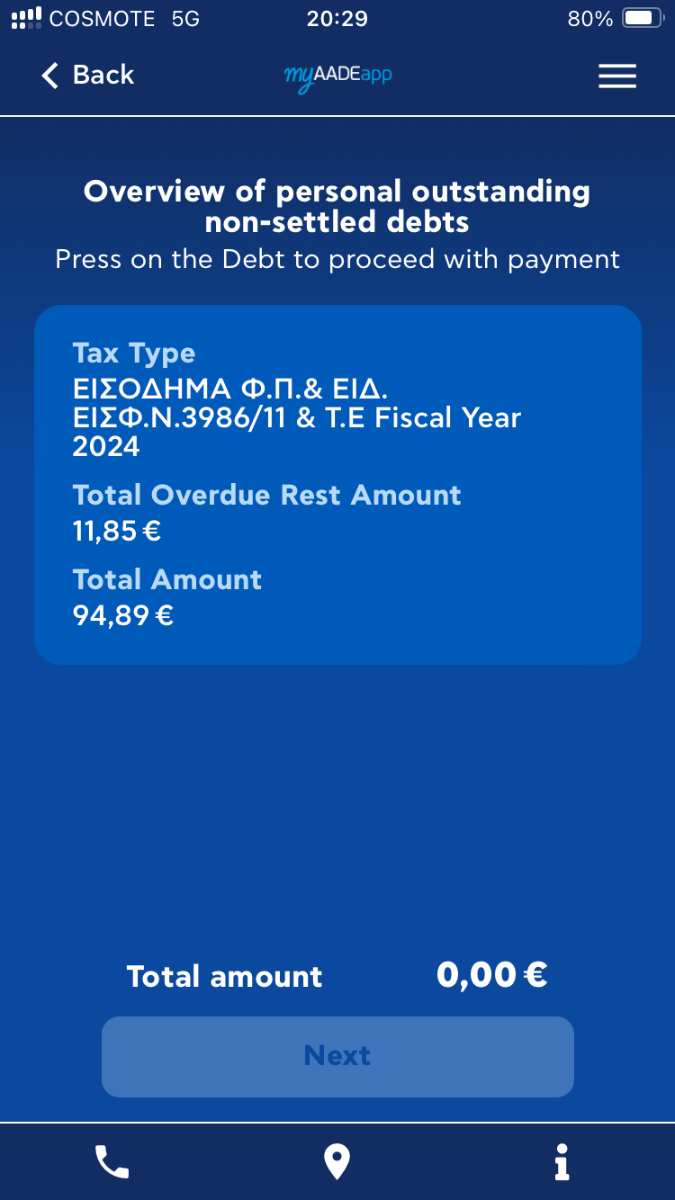 dtzgr Δημοσ. 15 Αυγούστου 2024 Δημοσ. 15 Αυγούστου 2024 2 ώρες πριν, Pinball1 είπε Ένας φίλος προσπαθεί να εξοφλήσει τον φόρο μέσω του myAADE app, όμως ενώ εμφανίζεται κανονικά η συνολική οφειλή στο επόμενο βήμα δείχνει ότι το χρεωστικό ποσό είναι 0,00€ με αποτέλεσμα όχι μόνο να μη μπορεί να πληρώσει αλλά να χρεώνεται και τις προσαυξήσεις. Γνωρίζει κανείς τι πρέπει να κάνει; Press on the debt to proceed with payment = Πατήστε στην οφειλή για να προχωρήσετε σε πληρωμή Δηλαδή στην τελευταία οθόνη πρέπει να επιλέξεις τη συγκεκριμένη οφειλή ώστε να δηλώσεις ότι θέλεις να την πληρώσεις (γιατί πχ μπορεί να είχες 2 οφειλές και να ήθελες να πληρώσεις μόνο τη μια κλπ). 1