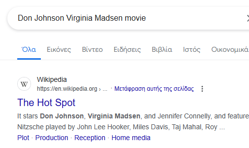Arkin Δημοσ. 6 Ιουλίου 2024 Δημοσ. 6 Ιουλίου 2024 13 λεπτά πριν, Millennium είπε Και αυτή δεν έχει βρεθεί νομίζω. Αυτη δεν την εχω δει αλλα ξερω τον Don Johnson που ειναι στην εικονα και την Virginia Madsen οποτε την βρηκα The Hot Spot του 1990 παιζει και η Connelly ευκαιρια να τη δουμε. 2
