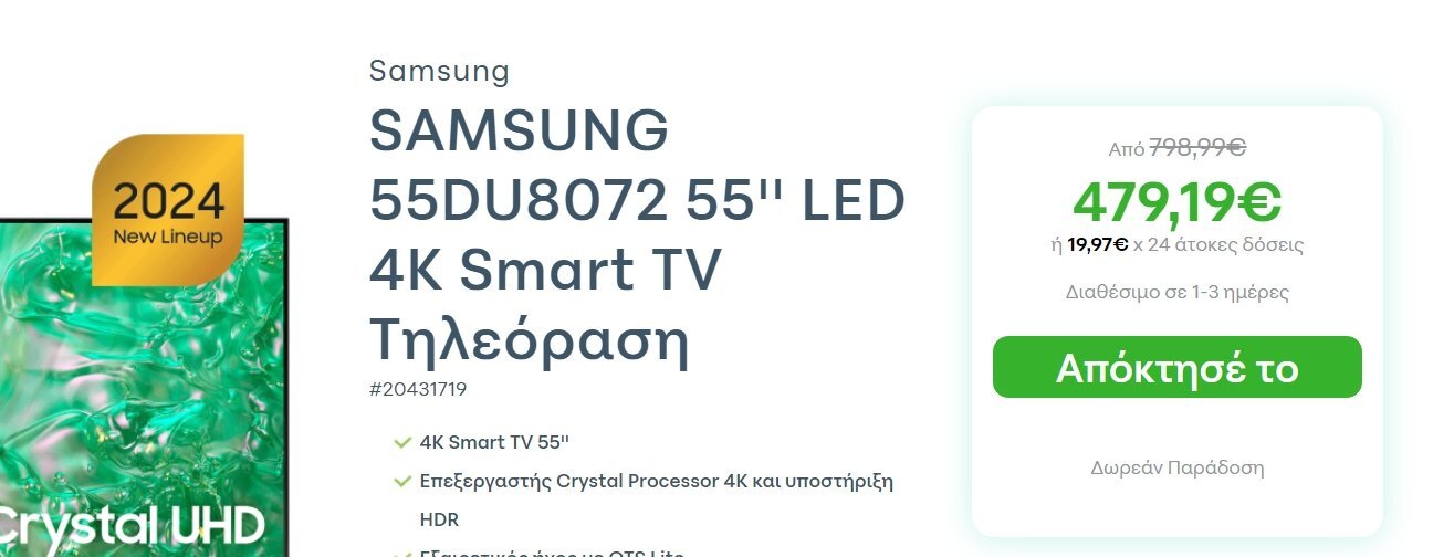 darkmatinee Δημοσ. 28 Μαΐου 2024 Μέλος Δημοσ. 28 Μαΐου 2024 12 minutes ago, matrixxx said: Διαθεσιμη ειναι, γι αυτο αλλωστε δεν μπηκε [ΤΕΛΟΣ] ή [ΕΞΑΝΤΛΗΘΗΚΕ] στον τιτλο. Το ζητημα ειναι αν ειναι καλη η τιμη, αν ειναι πραγματι προσφορα. Πάντως ακόμα και η ίδια η Samsung, 599€ την έχει: https://www.samsung.com/gr/tvs/uhd-4k-tv/du8000-55-inch-crystal-uhd-4k-tizen-os-smart-tv-ue55du8072uxxh/ μιας και είναι μοντέλο του 2024...