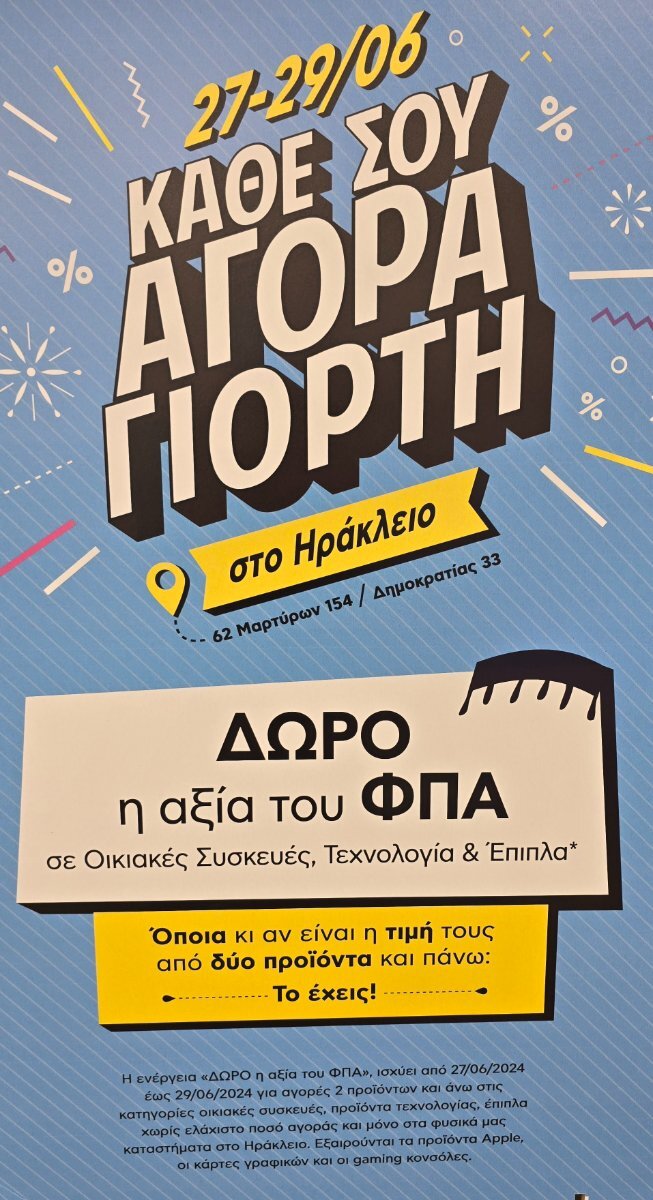 saboter7 Δημοσ. 27 Ιουνίου 2024 Δημοσ. 27 Ιουνίου 2024 (επεξεργασμένο) Η ενέργεια ΔΩΡΟ η αξία του ΦΠΑ, ισχύει από 27/06/2024 έως 29/06/2024 για ανορές 2 προΐόντων και άνω στις κατηγορίες οικιακές συσκευές, προϊόντα τεχνολογίας, έπιπλα χωρίς ελάχιστο ποσό αγοράς και μόνο στα φυσικά μας καταστήματα στο Ηράκλειο και στα Χανιά. Εξαιρούνται τα προϊόντα Αpple, οι κάρτες γραφικών και οι gaming κονσόλες Επεξ/σία 27 Ιουνίου 2024 από saboter7 1