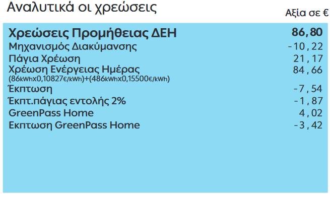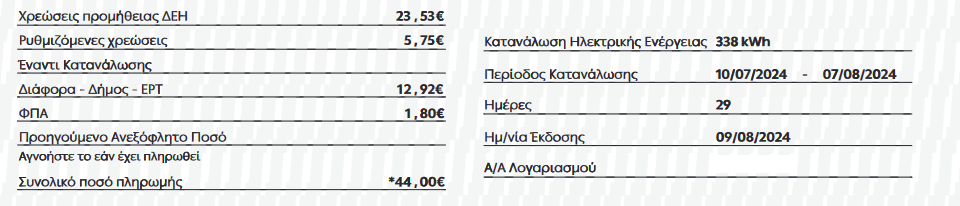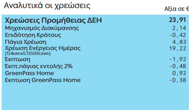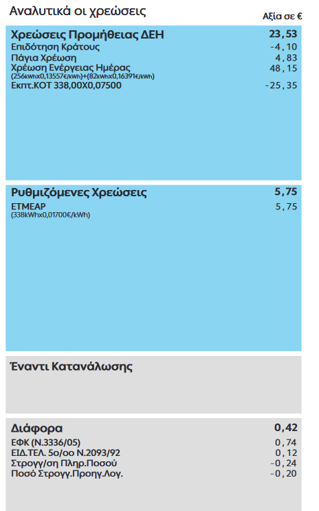 Gilles27 Δημοσ. 15 Αυγούστου 2024 Δημοσ. 15 Αυγούστου 2024 (επεξεργασμένο) Στις 2/8/2024 στις 11:48 ΠΜ, Arkin είπε Στις 2/8/2024 στις 11:42 ΠΜ, tempo είπε τελικά ας μου επιβαιώσει κάποιος αν κατάλαβα καλά.....όσοι έχουν myhome4all και έχουν κάνει την έναρξη τους πρώτους 2 μήνες του 2024 θα έχουν έκπτωση 20% και θα πάρουν και την κρατική επιδότηση. Δηλαδή τιμή κιλοβατώρας περίπου 0,2ευρώ μείον την κρατική επιδότηση. Κάπως έτσι και 10% έκπτωση αυτοί που έχουν 4all από πιο πριν ενώ οσοι ήρθαν 4all από 1 Ιουνίου θα πάρουν 53%. Συν 1.6 λεπτά από το κράτος. Η λύση να πας πράσινο και ξανά στο κίτρινο ώστε να πάρεις το 53%. Αλλιώς 20 λεπτά η kw μέχρι 500 και 23 24 για παραπάνω. Καλησπέρα σε όλους. Λόγω ελλιπούς χρόνου, αδυνατώ να παρκολουθώ τα τεκταινόμενα τόσο στενά. Σήμερα λοιπόν έκανα τον κόπο να μπω να δω τους τελευταίους λογαριασμούς μου. Σας παραθέτω παρακάτω screenshots Εκκαθ. 04.03-08.07 Έναντι 09.07-06.08 Έπειτα προσέτρεξα στις δημοσιεύσεις εδώ όπου είδα τα παραπάνω γραφόμενα. Θα ήθελα να ρωτήσω. Αν καταλαβαίνω καλά, η έκπτωση που μου χορηγείται είναι 10% (;). Αν ισχυει αυτό, πως μπορεί να είναι συμβατό με το ότι έχει ενεργοποιηθεί η σύμβαση το Μάρτη; Και αν έχω καταλάβει καλά, για τον Αυγουστο η χρέωση μου θα είναι 0,9*0,155+0,08219-0,016=0,20569/kwh; Παρακαλώ τα φώτα σας, γιατί αν είναι έτσι, με το A/C να καιει ολη μέρα πλέον, να επιστρέψω Γ1 και ξανά μετά 4all όπως προτείνεται παραπάνω, ή να κοιτάξω για εναλλακτικό πάροχο. Ευχαριστώ προκαταβολικά. ΥΓ: και κάτι τελευταίο... ισχύει η χωρίς ποινή μετάβαση απο πάροχο σε πάροχο ακόμη όπως τα προηγούμενα έτη λόγω χρηματιστηρίου ενέργειας, ή θα πρέπει να παραμείνω ΔΕΗ μέχρι 22.03.2025 για να μην έχω penalty; Επεξ/σία 15 Αυγούστου 2024 από Gilles27
